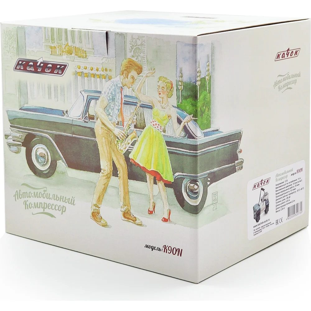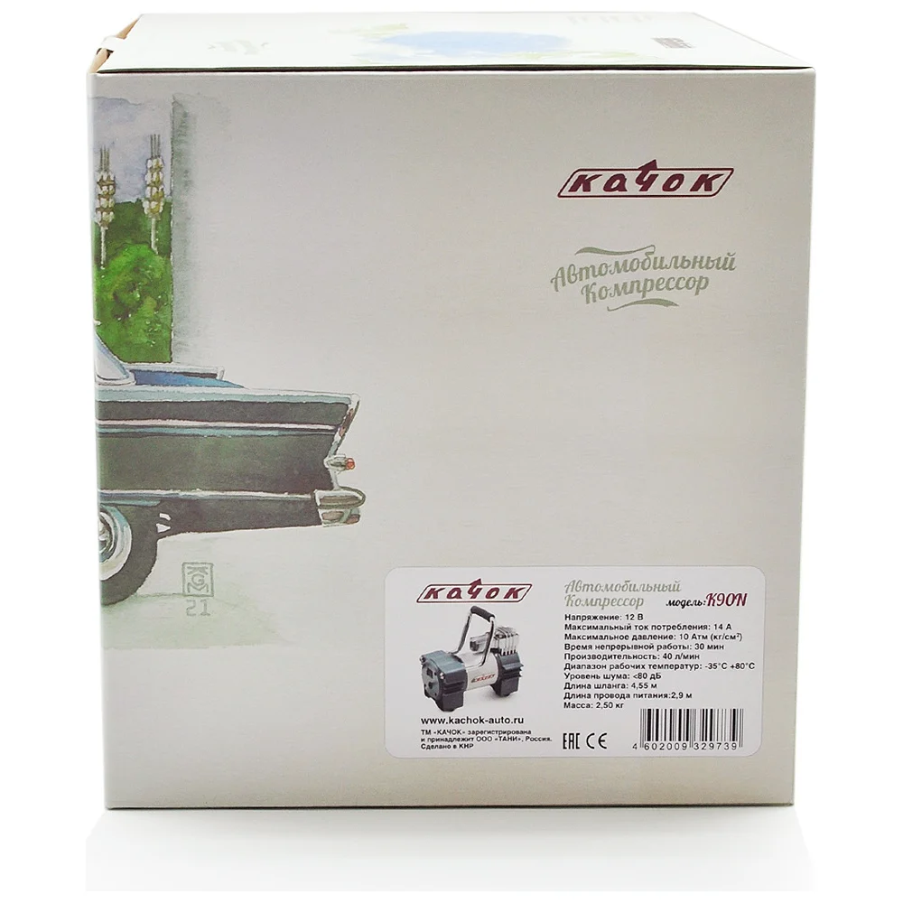 Комплектация Компрессор Качок К90N; Переносная сумка для хранения; Набор переходных штуцеров - 4 штуки; Инструкция по эксплуатации; Упаковочная коробка