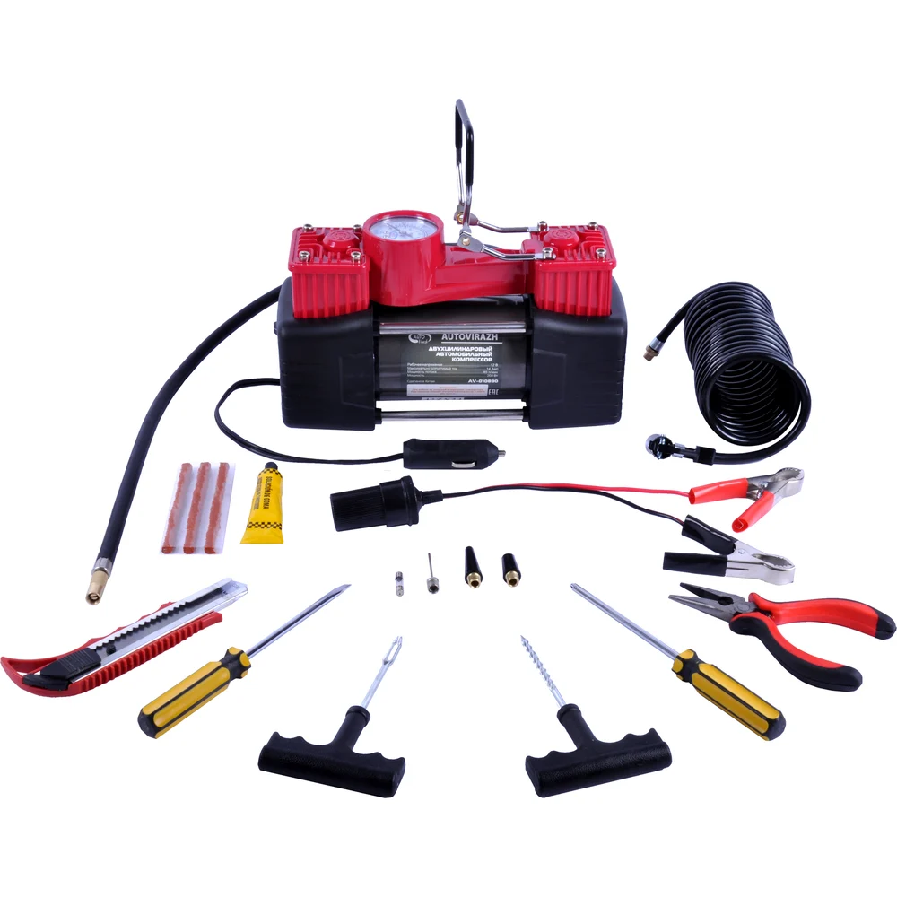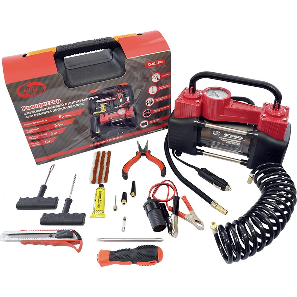 Купить Двухцилиндровый компрессор 85 л/мин в кейсе с набором для ремонта колес AUTOVIRAZH AV-010890 по лучшей цене с доставкой - интернет магазин №1 в России