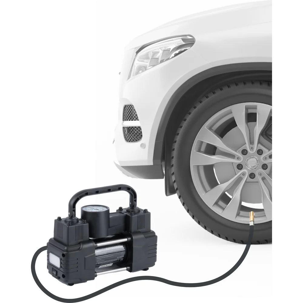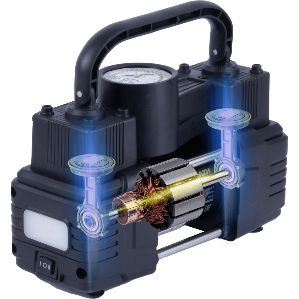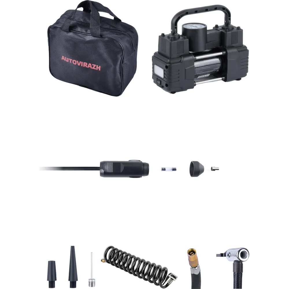 Купить Двухцилиндровый компрессор AUTOVIRAZH 55 л/мин мини, с манометром, доп. спиральный шланг AV-010550 по лучшей цене с доставкой - интернет магазин №1 в России