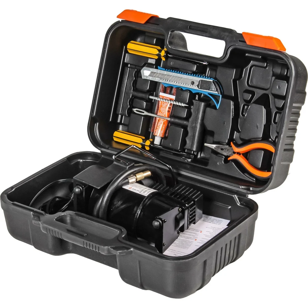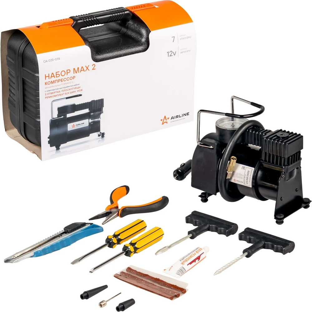 Купить Компрессор AIRLINE TORNADO S с комплектом инструментов, в кейсе, 2 отвертки, ремкомплект для бескамерных шин, нож, плоcкогубцы CA-020-01N по лучшей цене с доставкой - интернет магазин №1 в России