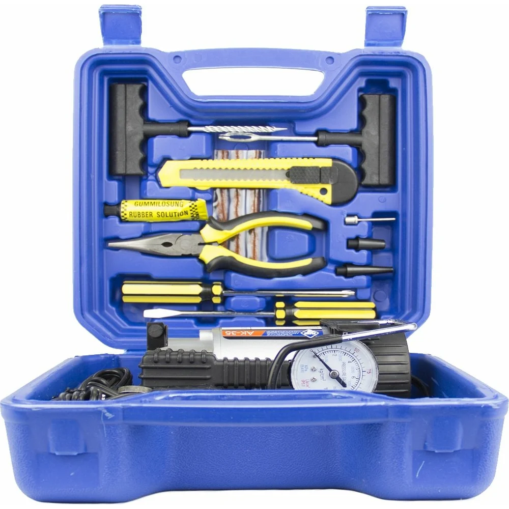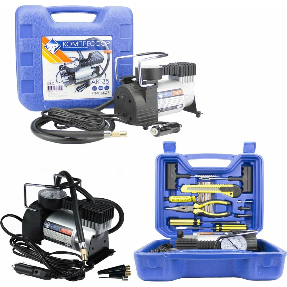 Комплектация Компрессор; Набор инструментов для ремонта шин; Комплект адаптеров; Кейс; Инструкция по эксплуатации; Упаковка