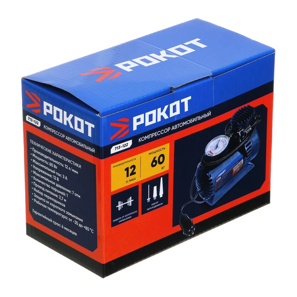 Купить Компрессор автомобильный РОКОТ 12 л/мин, 60 Вт, провод 2,7 м+ переходники 713-122 по лучшей цене с доставкой - интернет магазин №1 в России