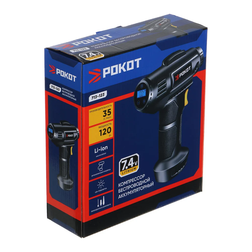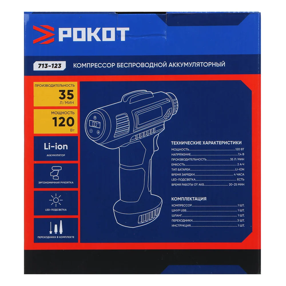 Купить Компрессор беспроводной РОКОТ 120Вт, 35 л/мин, 2000МА, аналоговый дисплей 713-123 по лучшей цене с доставкой - интернет магазин №1 в России