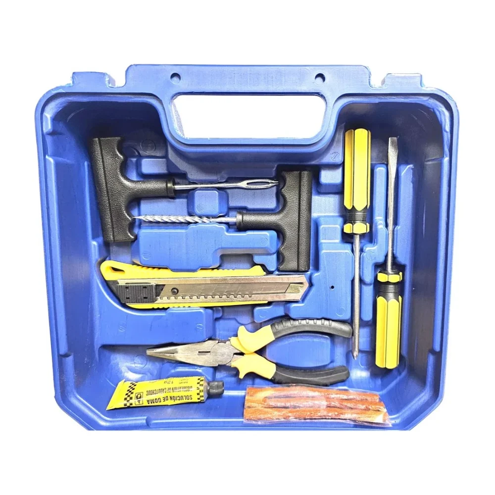 Комплектация компрессор,; насадки для насоса,; 2 отвёртки,; нож,; плоскогубцы,; шило,; рашпиль; 5 жгутов,; клей,; пневмошланг с манометром