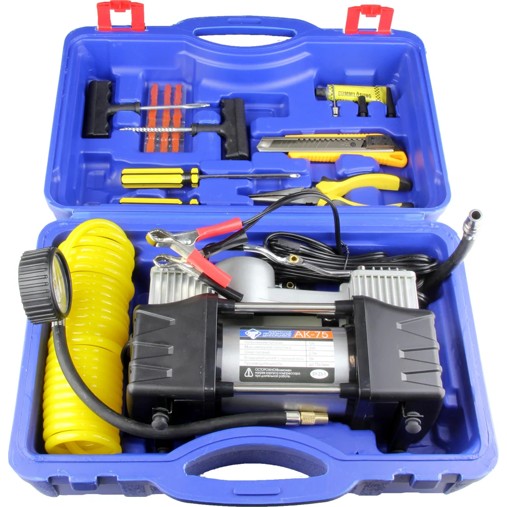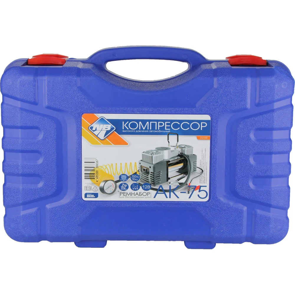 Купить Компрессор Nova Bright АК-75 двухпоршневой, до 75 л/мин., 150 PSI, 12В, пластиковый кейс с инструментами 36448 по лучшей цене с доставкой - интернет магазин №1 в России