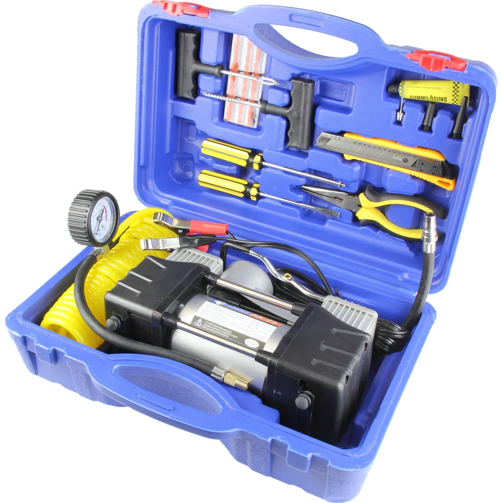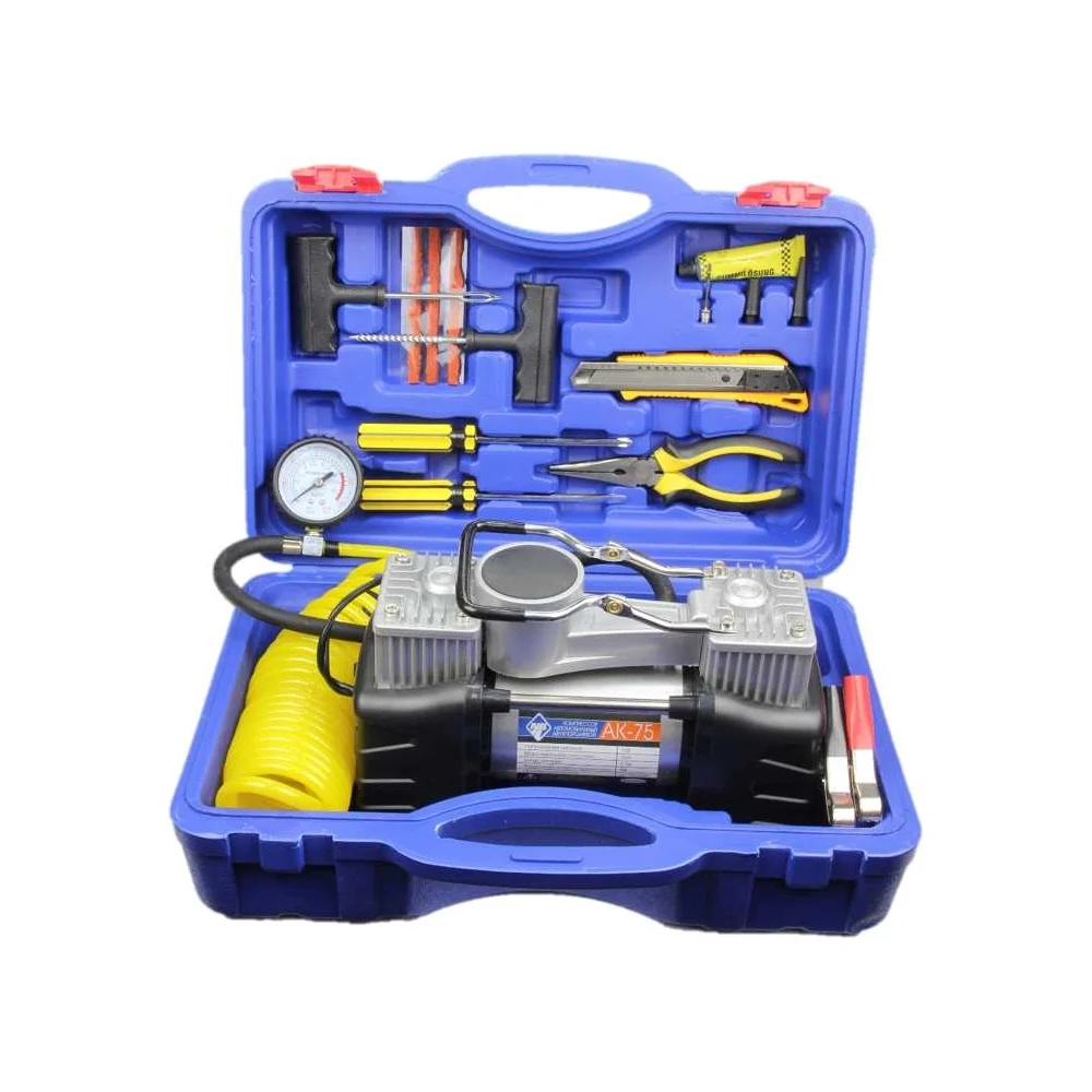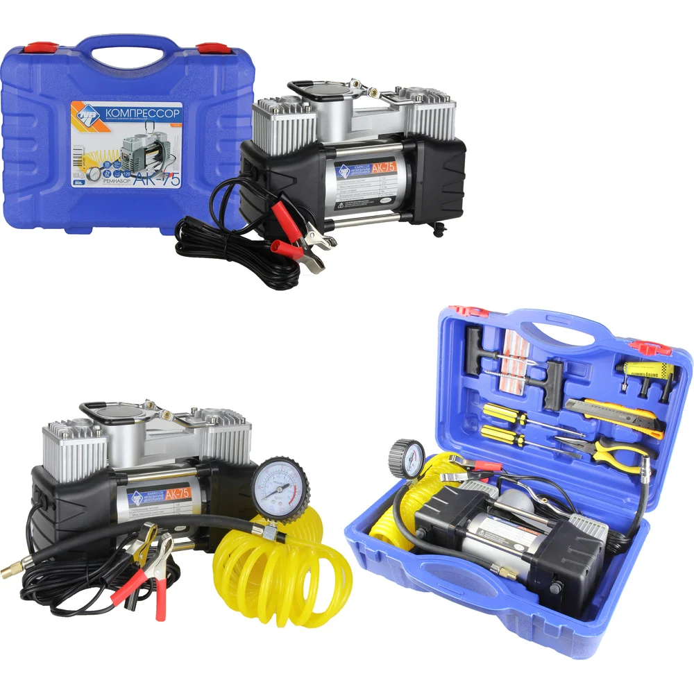 Комплектация Компрессор двухпоршневой - 1 шт; Набор дорожного инструмента; Кейс
