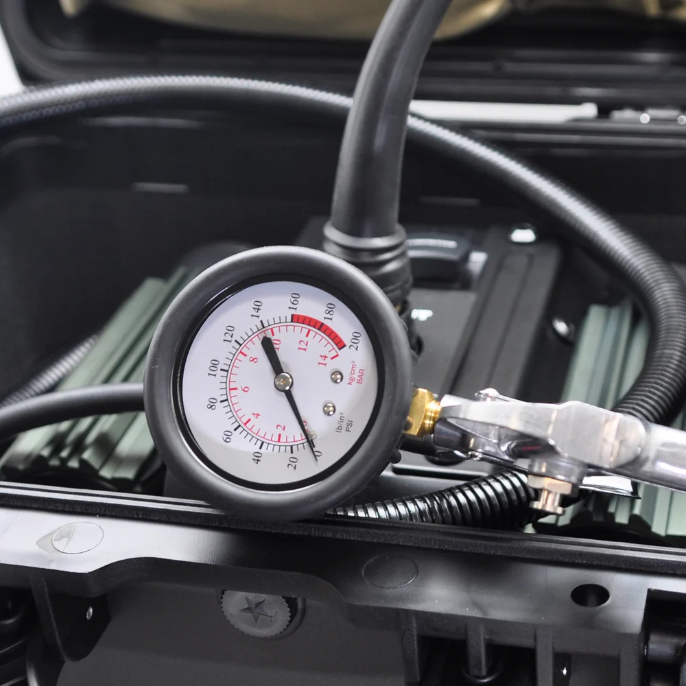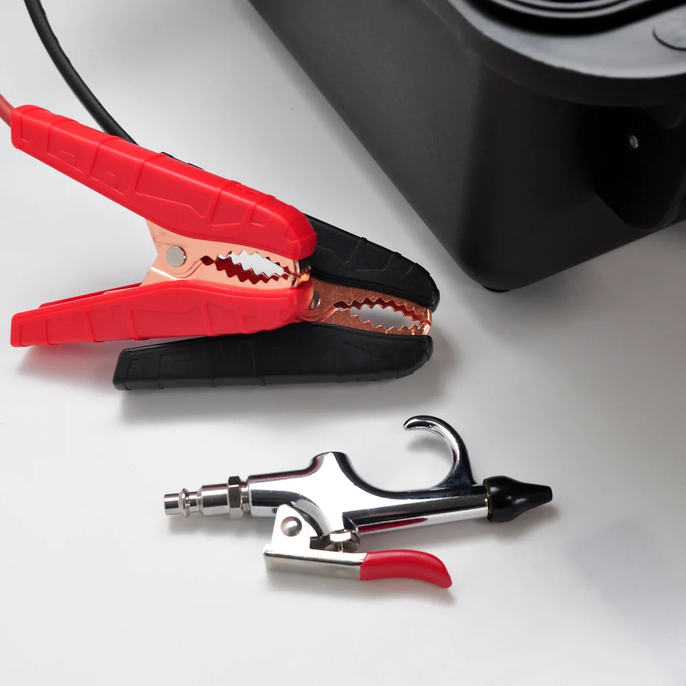 Комплектация Пластиковый кейс; Органайзер; Пневмопистолет; Воздушный шланг; Воздушные фильтры; Ручка для переноски; Кнопка включения; Защитные предохранители; Быстросъемное соединение; Продувочная насадка; Комплект насадок; Клеммы подключения