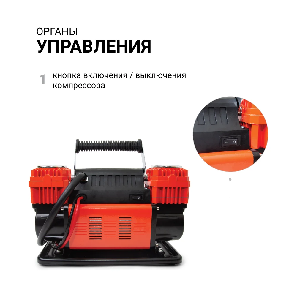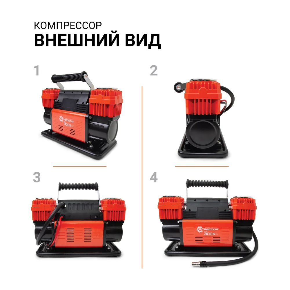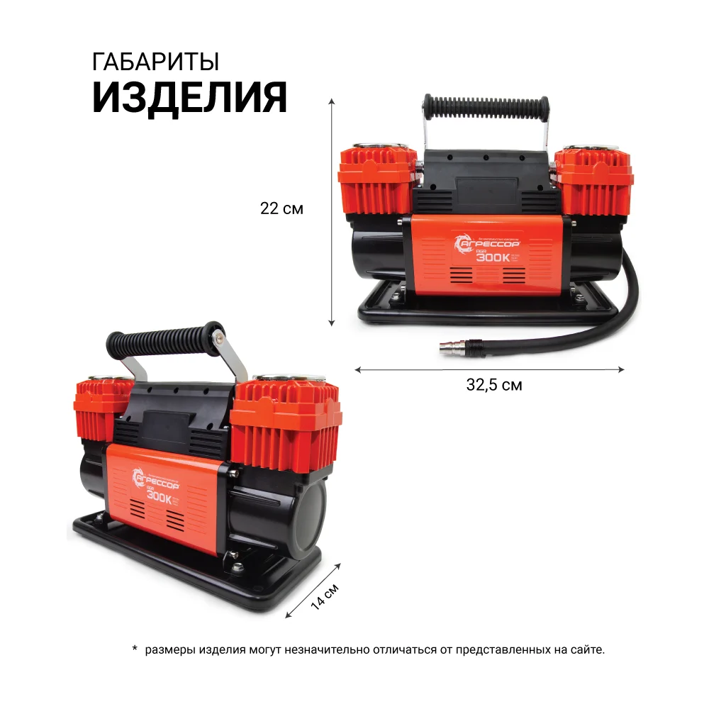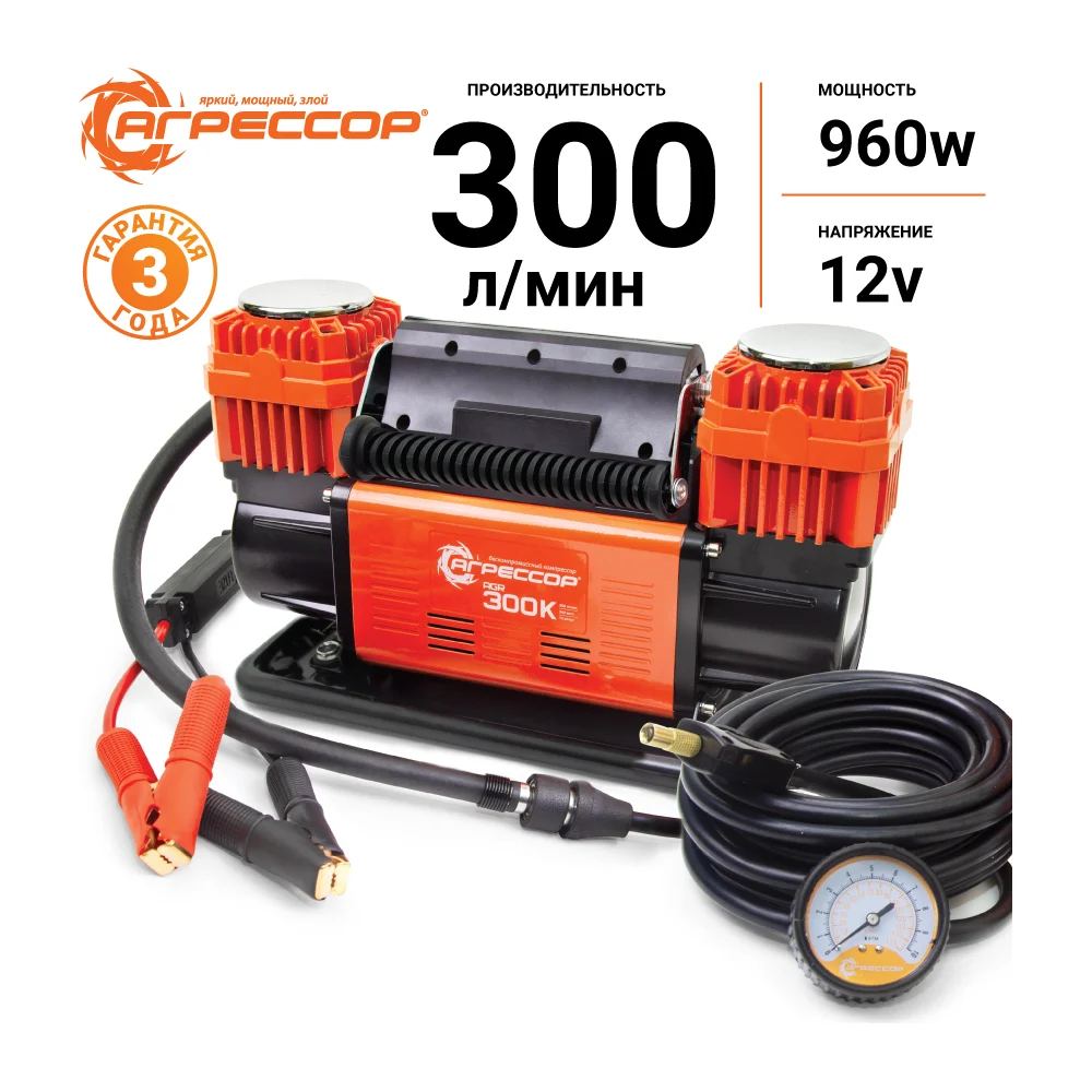 Воздушный компрессор Агрессор 300 л/мин, 12 В/90 А, шланг 8 м, шнур питания 2.4 м, питание от акб AGR-300K