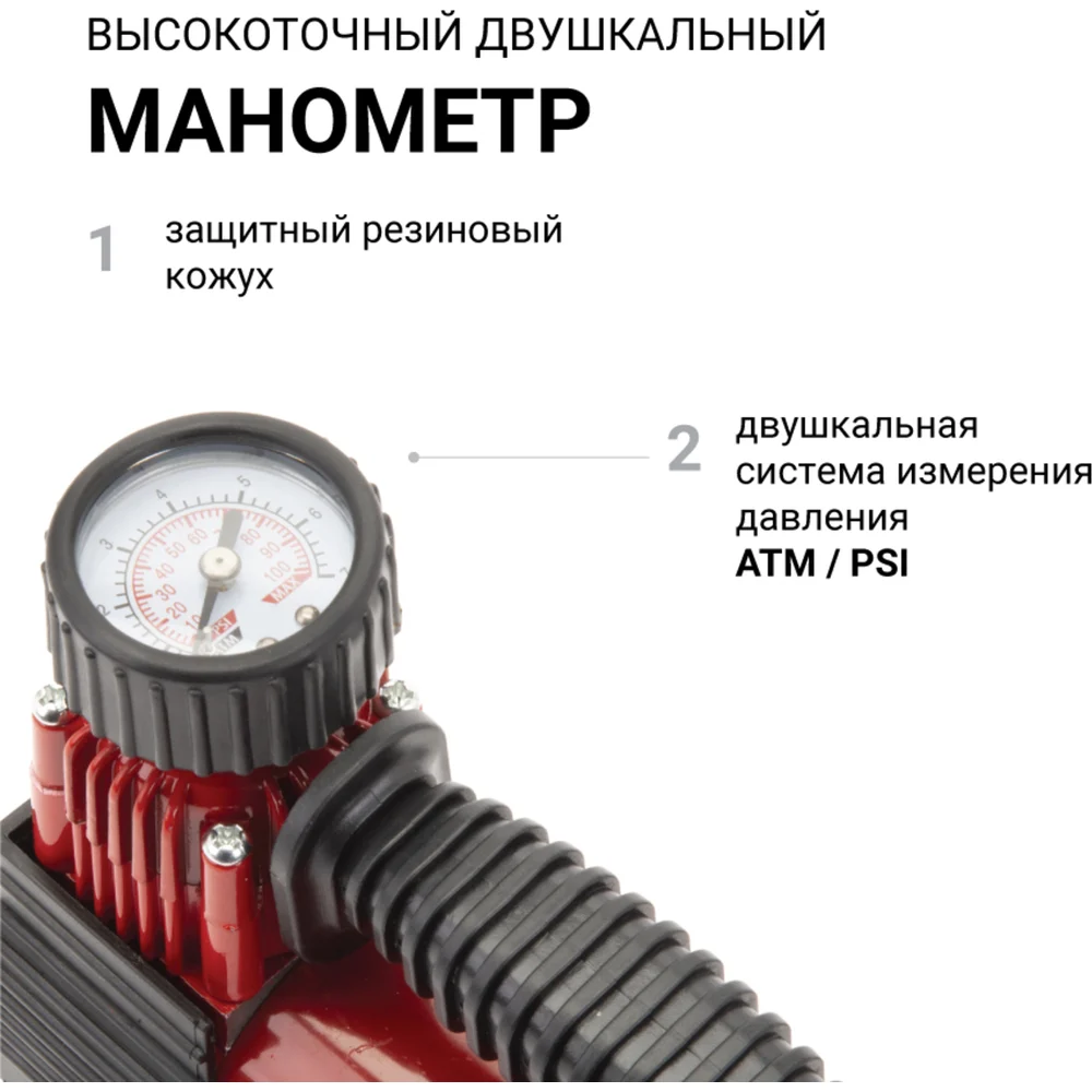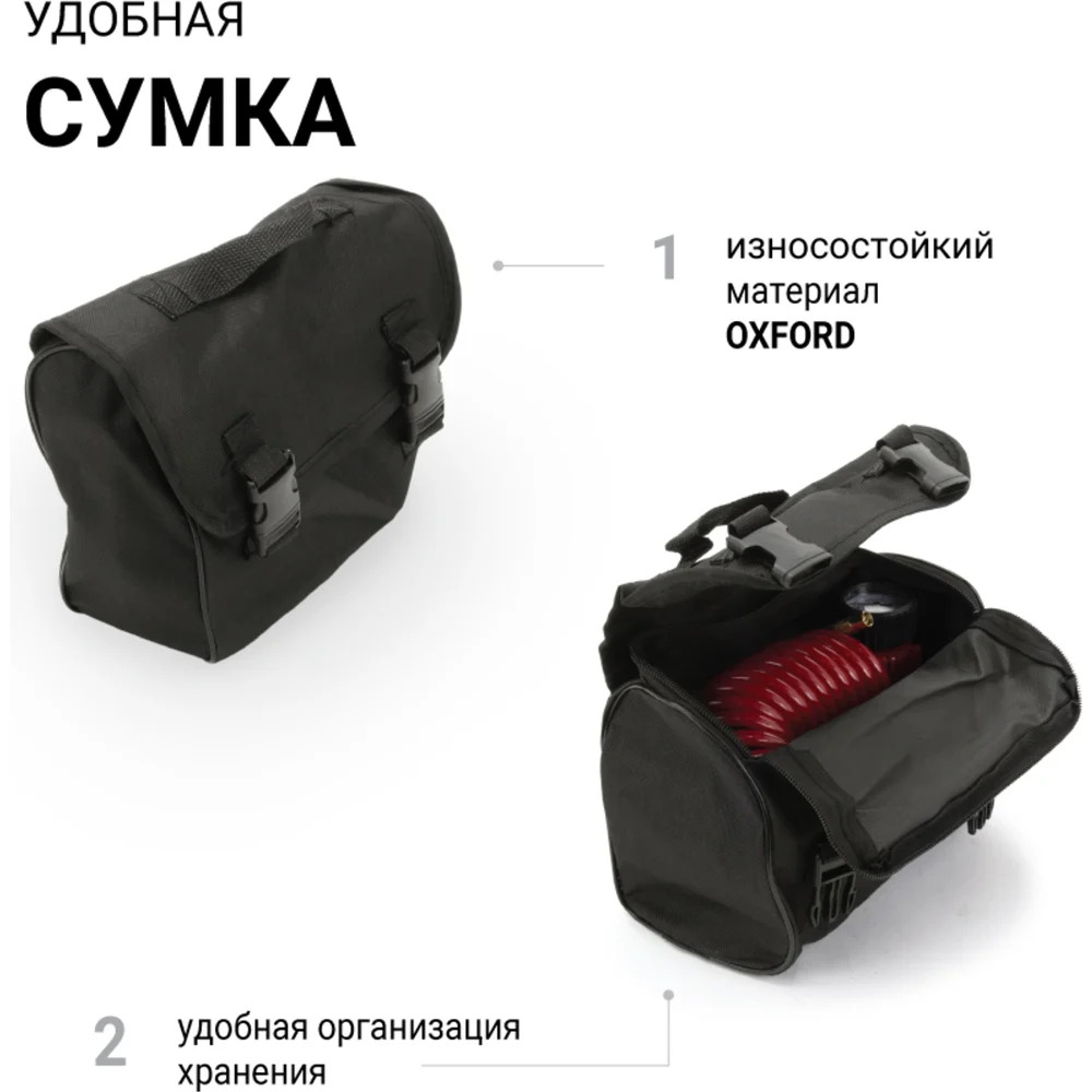 Комплектация Воздушный компрессор; Быстросъёмный воздушный шланг; Набор из трёх переходников; Сумка для хранения; Руководство по эксплуатации; Упаковка