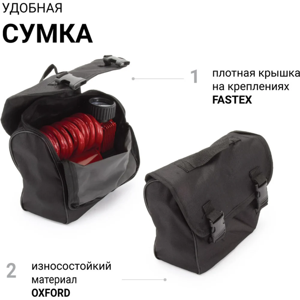 Комплектация Воздушный компрессор; Быстросъёмный воздушный шланг; Набор из трёх переходников; Сумка для хранения; Руководство по эксплуатации; Упаковка