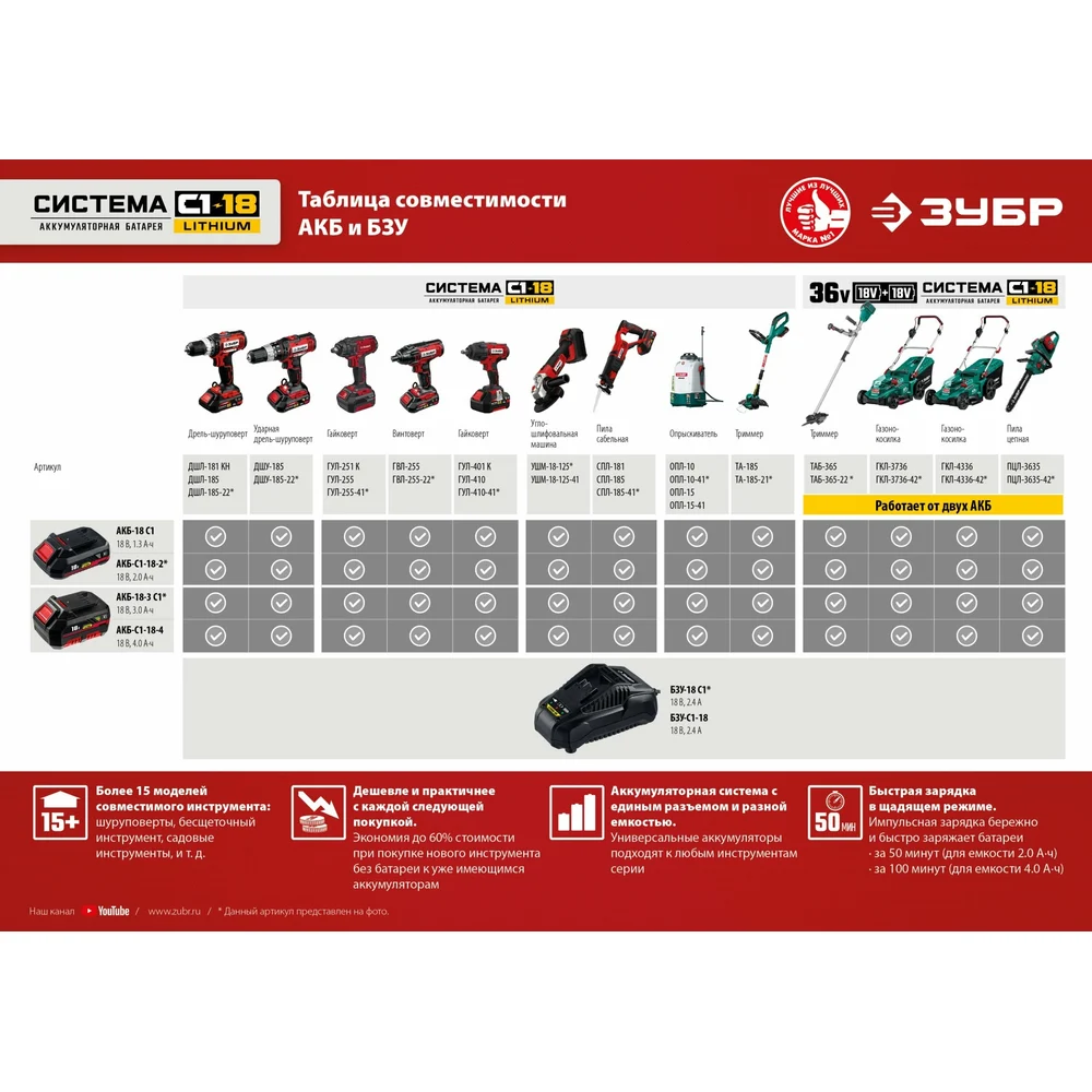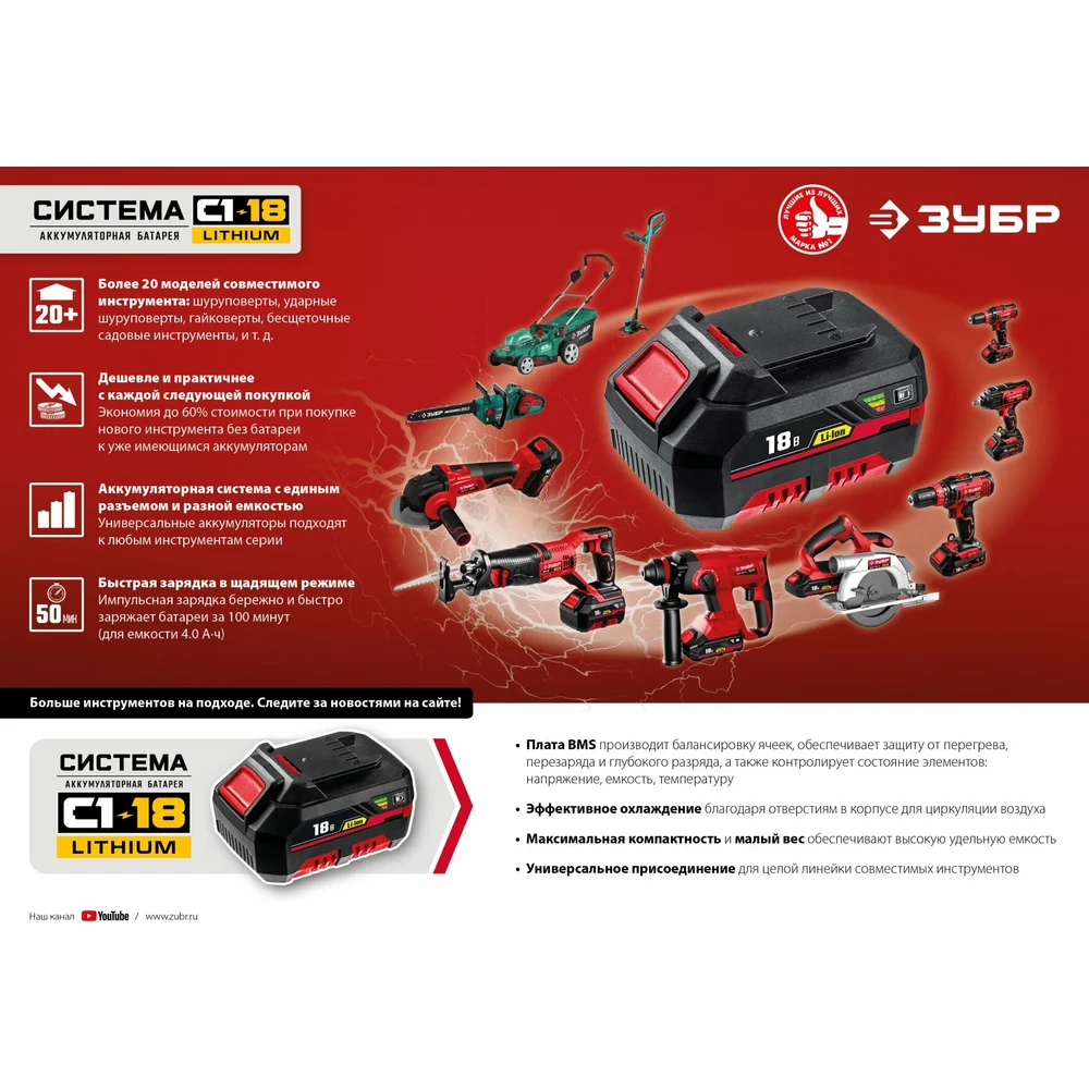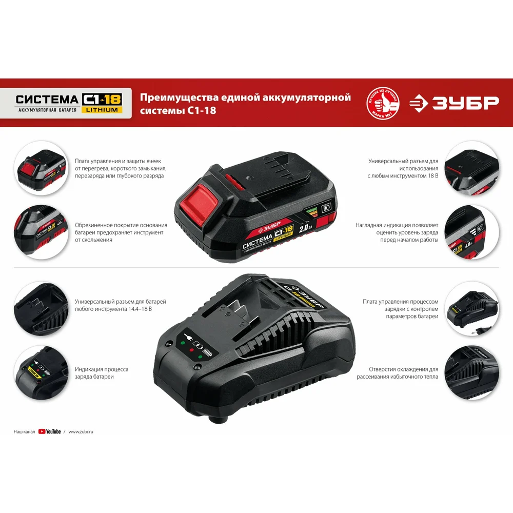 Купить Аккумуляторная батарея ЗУБР 18В, Li-Ion, 2Ач, тип С1 АКБ-С1-18-2 по лучшей цене с доставкой - интернет магазин №1 в России