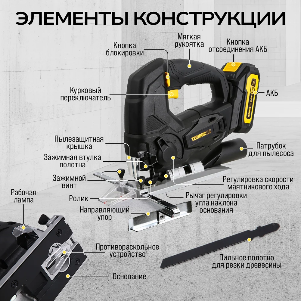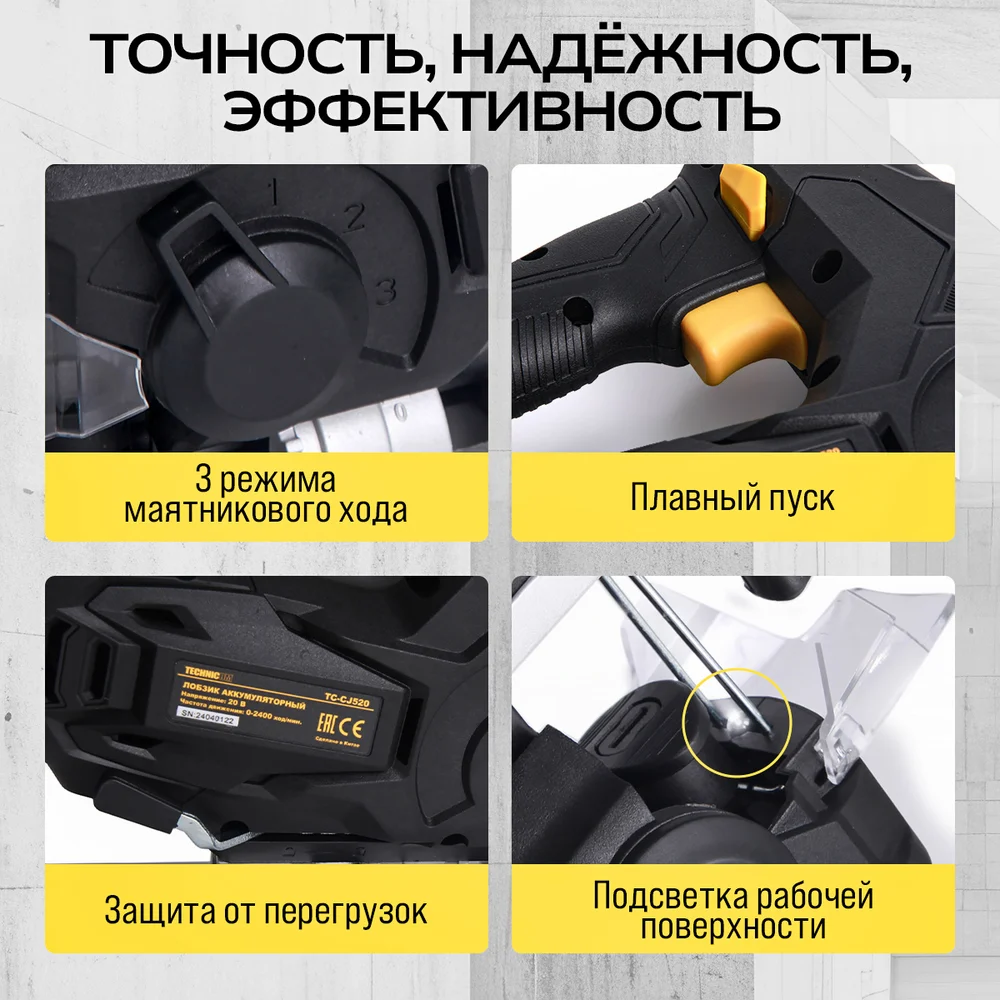 Купить Аккумуляторный лобзик TECHNICOM 20В 2Ач, 0-2400 ход/мин, LED подсветка, 45° угол распила, 3 режима маятникового хода TC-CJ520 по лучшей цене с доставкой - интернет магазин №1 в России