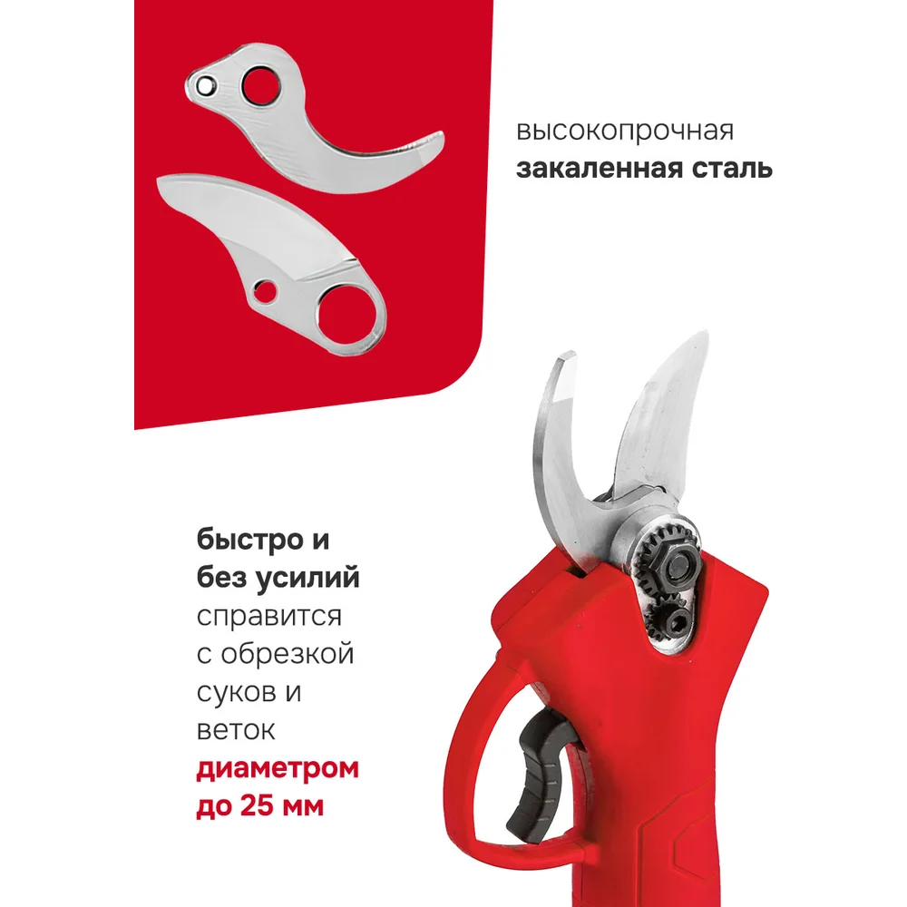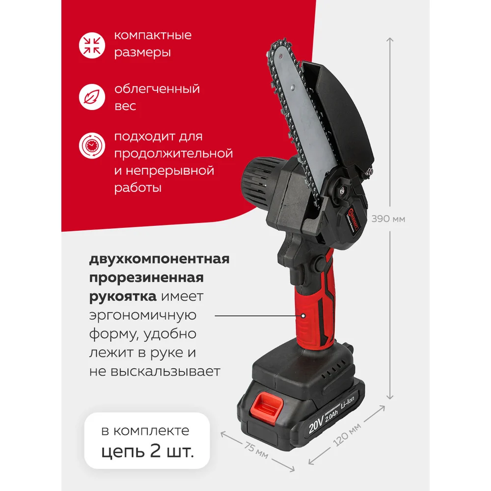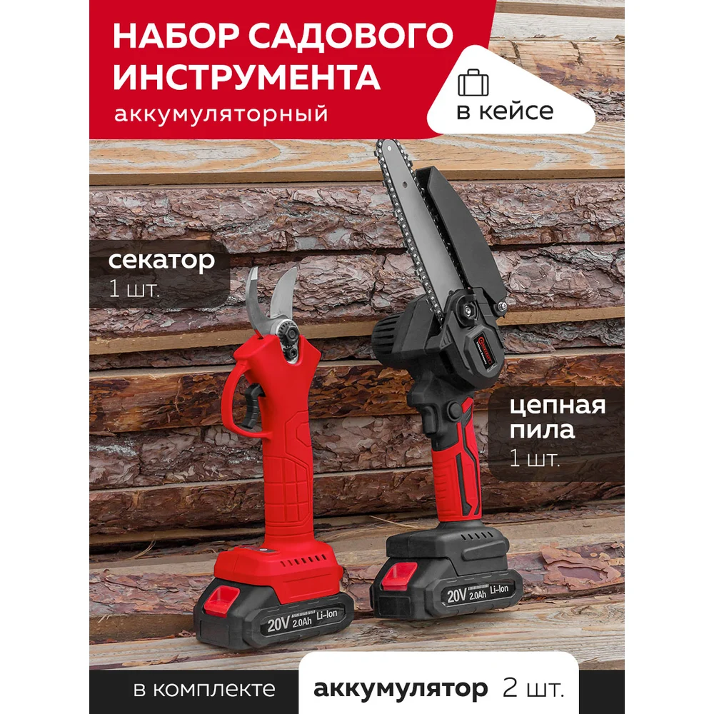 Комплектация пила аккумуляторная; секатор; зарядное устройство; аккумулятор 2 шт; цепь 2 шт; смазка; инструмент для замены; ключи Г-образные 2 шт; инструкция; точило; зажим; пластиковый кейс