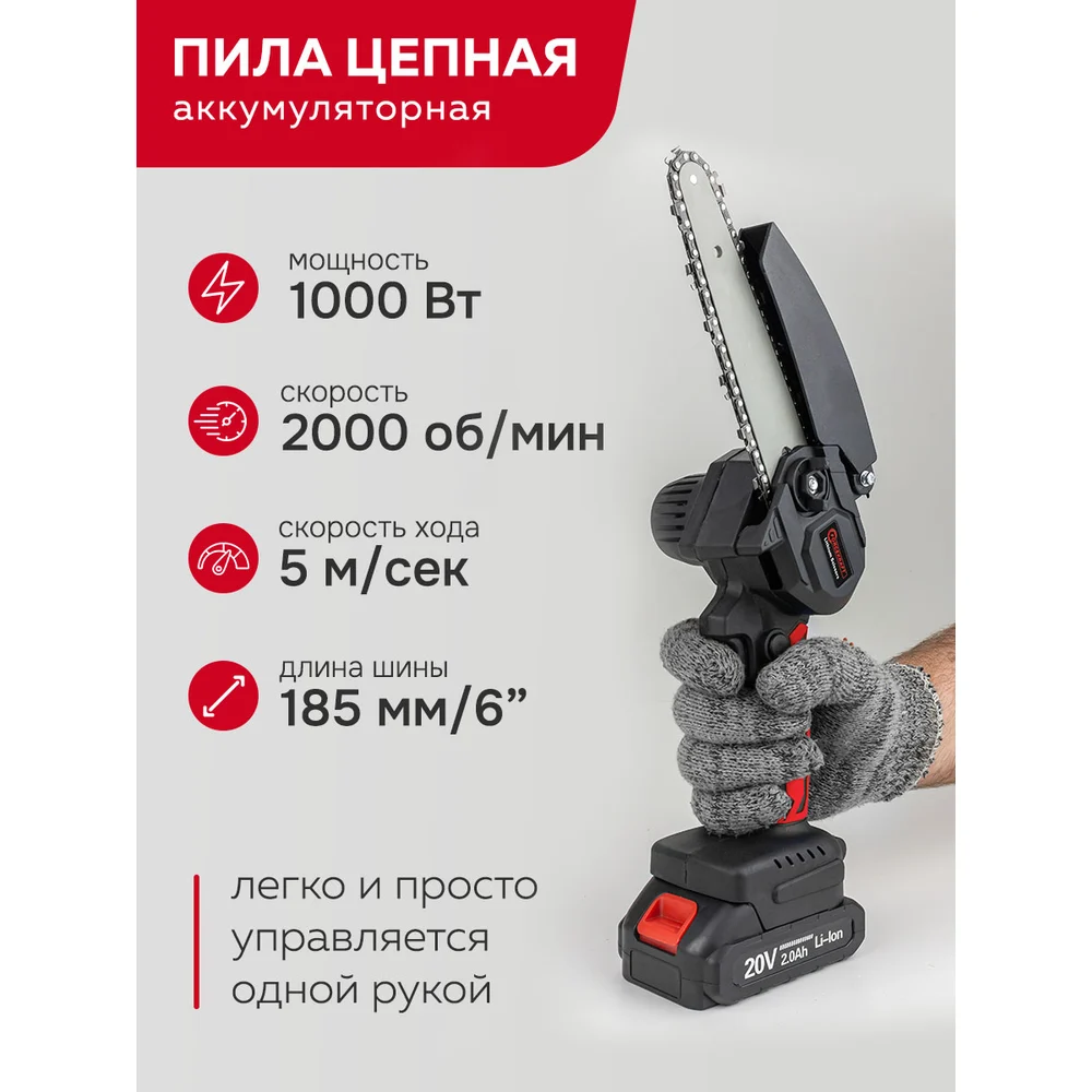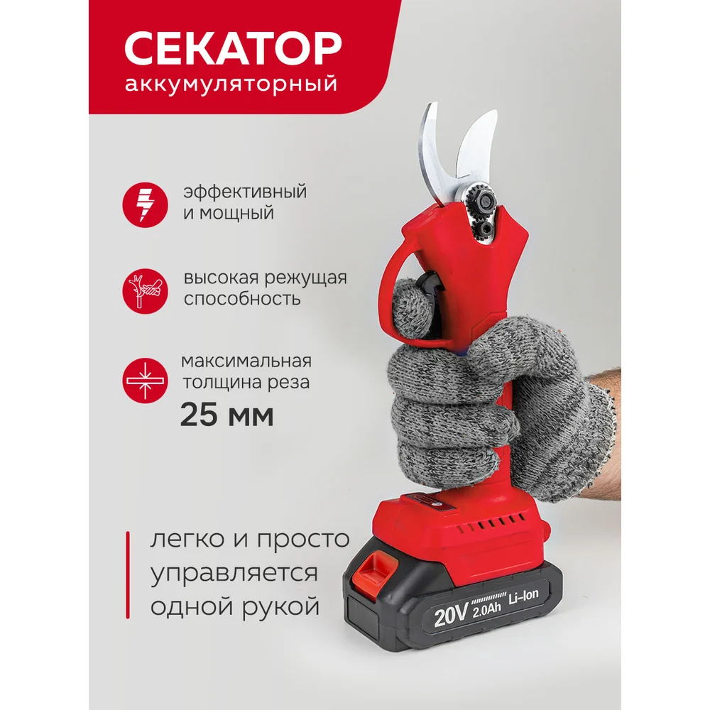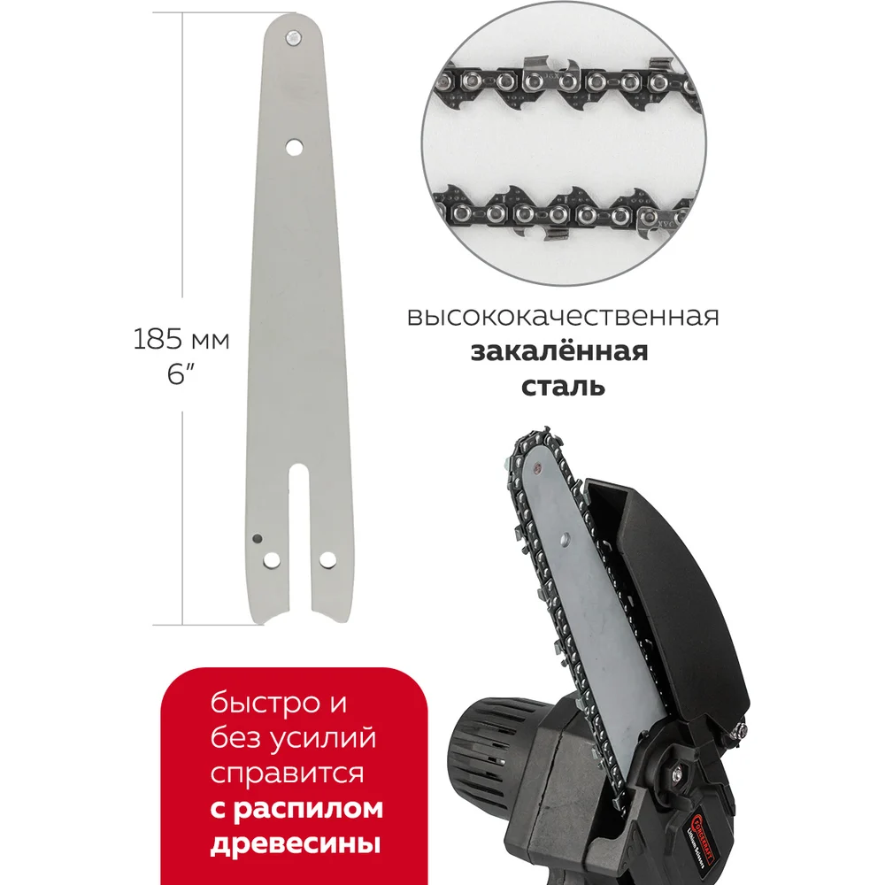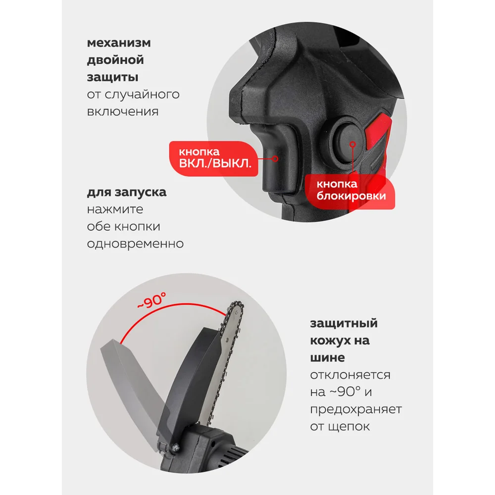 Комплектация пила аккумуляторная; секатор; зарядное устройство; аккумулятор 2 шт; цепь 2 шт; смазка; инструмент для замены; ключи Г-образные 2 шт; инструкция; точило; зажим; пластиковый кейс