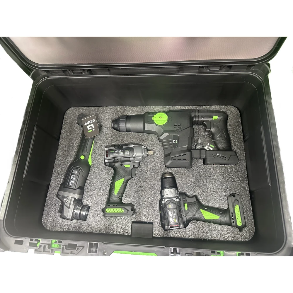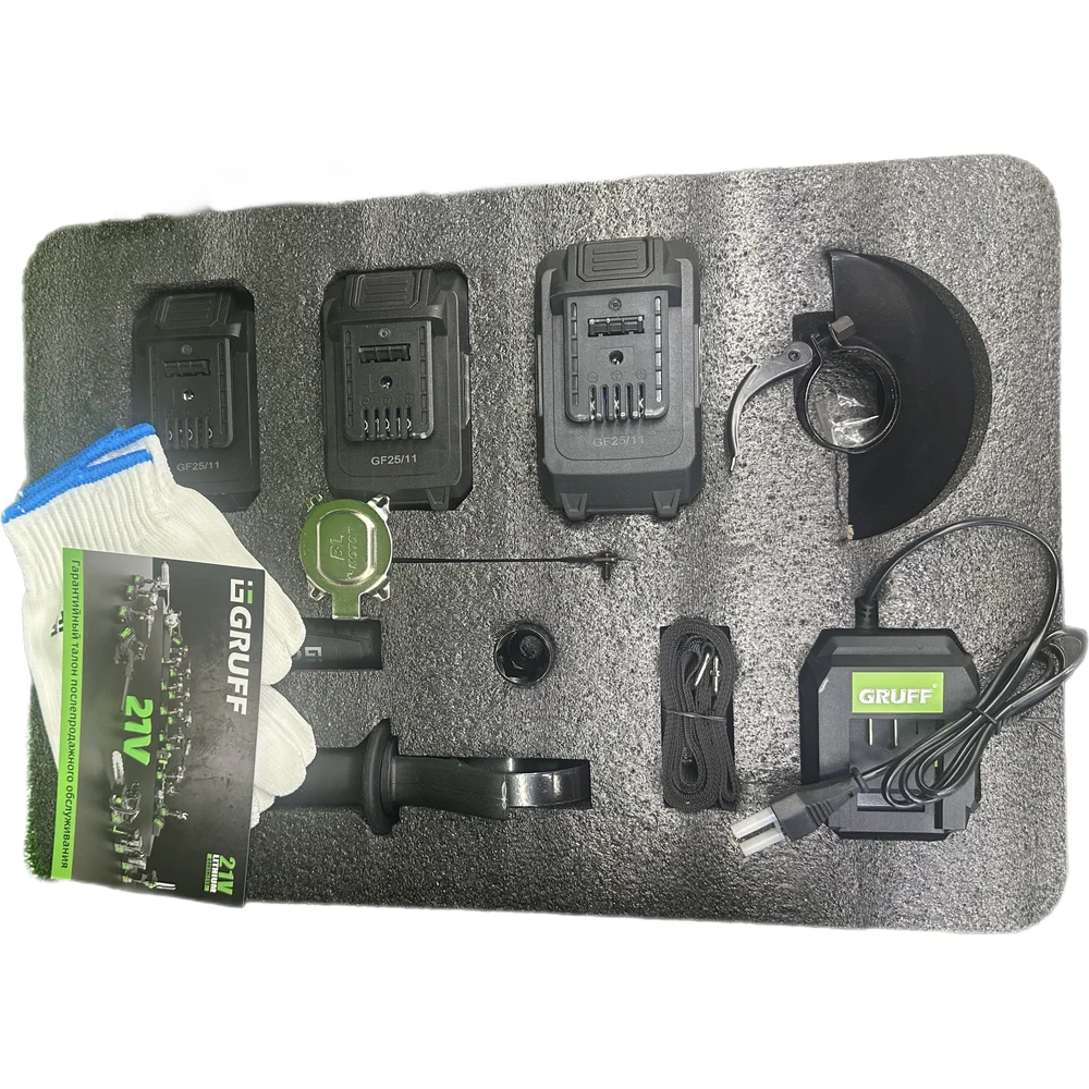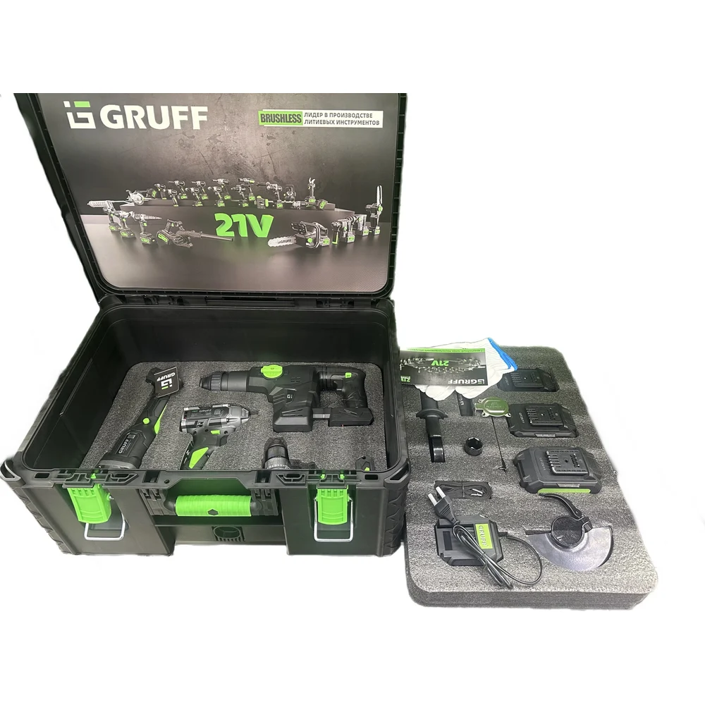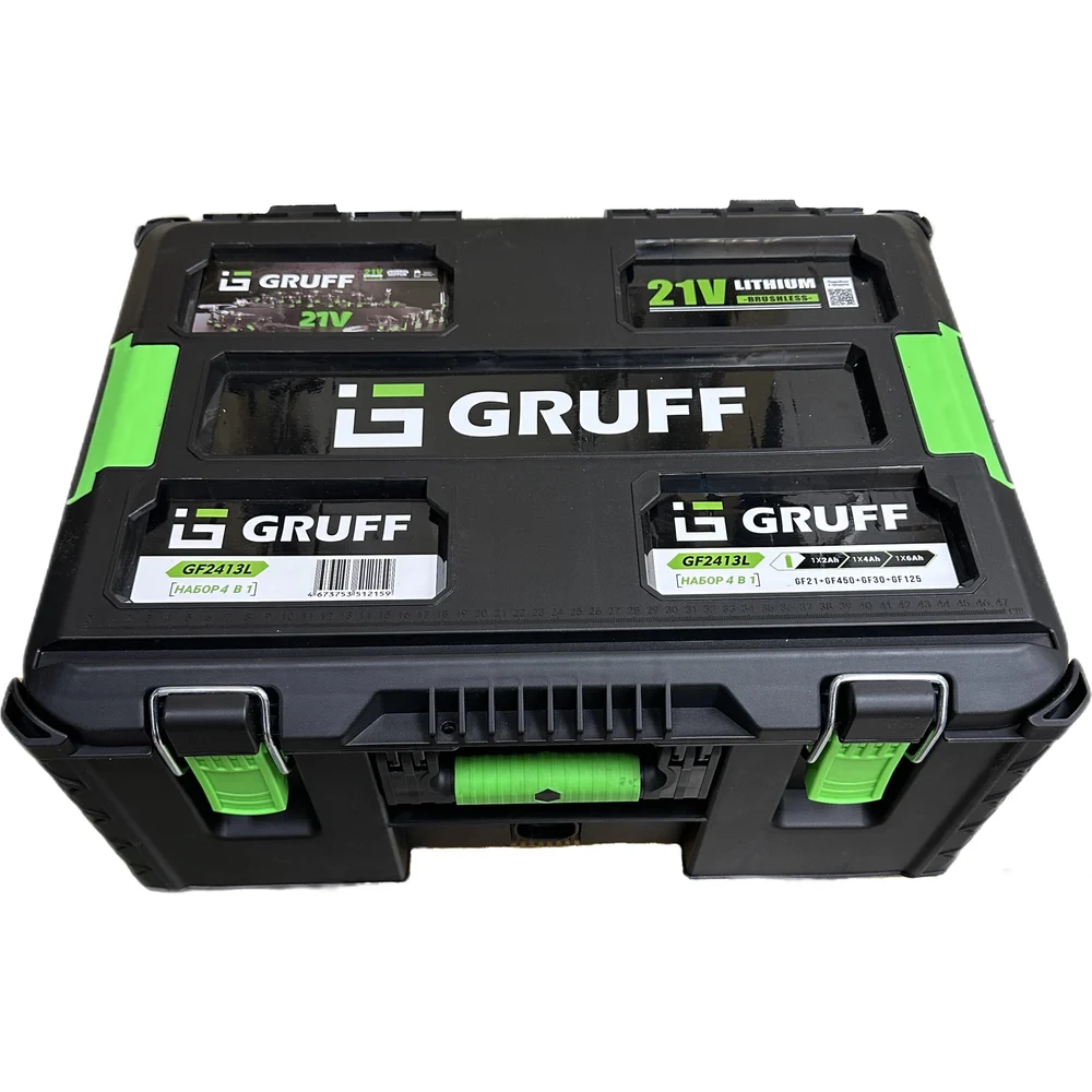 Комплектация Дрель-шуруповерт (GF-21),; Гайковерт (GF-450),; УШМ (GF-125),; Перфоратор (GF-30); АКБ Li-ION 21В 2Ah - 1 шт.,; АКБ Li-ION 21В 4Ah - 1 шт.,; АКБ Li-ION 21В 6Ah - 1 шт; Съемные эргономичные ручки для GF-30 и GF-450; Ключ для GF-125; Торцевая головка для GF-450; Зарядное устройство ZU-21; Перчатки, ремень; Кейс