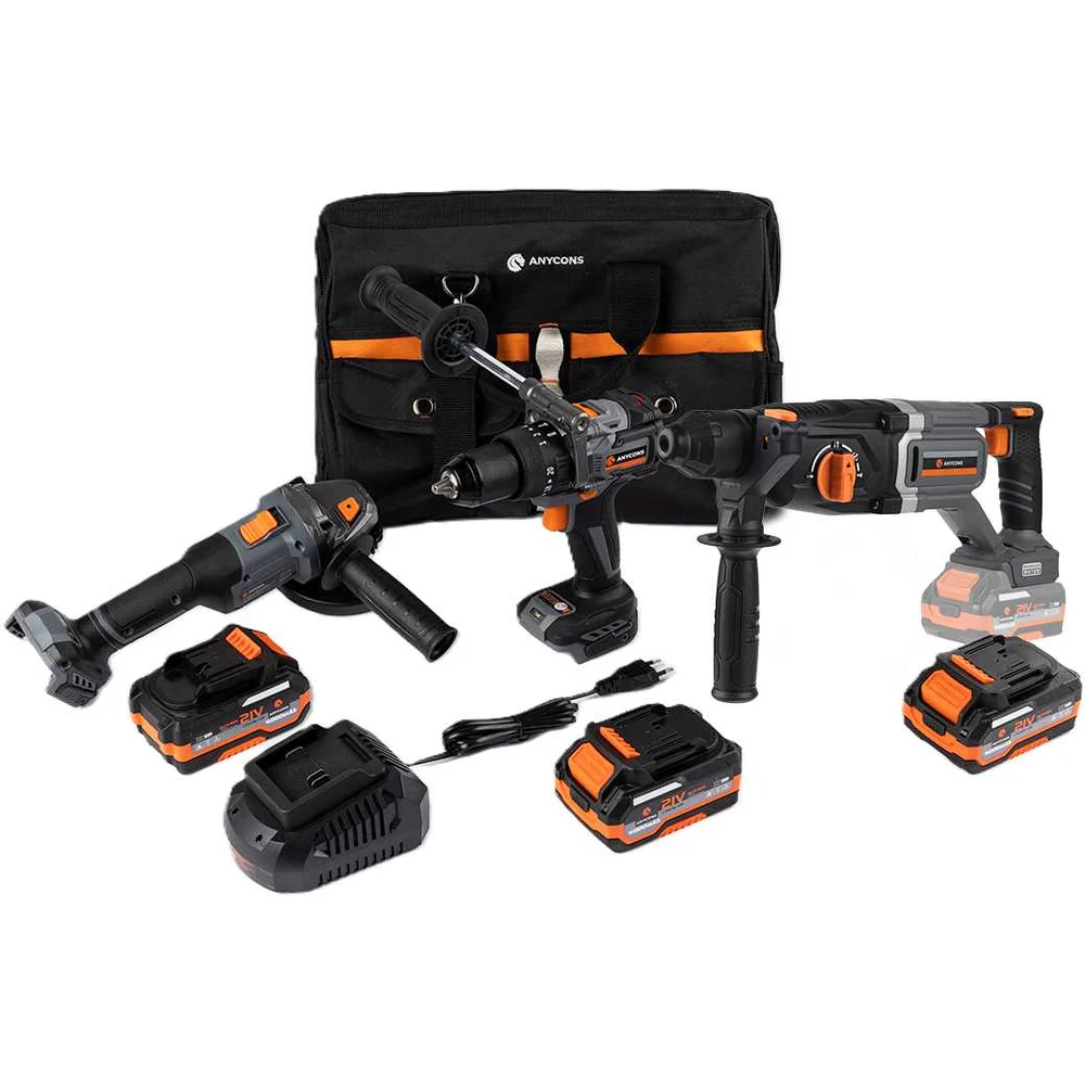 Комплектация аккумуляторная ударная дрель шуруповерт 150 Н.м; аккумуляторная УШМ 125мм; аккумуляторный перфоратор с силой удара 2,8Дж; аккумулятор 4А.ч. - 3шт; фирменная сумка Anycons с дополнительными карманами для хранения расходных материалов; Зарядное устройство АС-С1 4А.ч. - 1шт