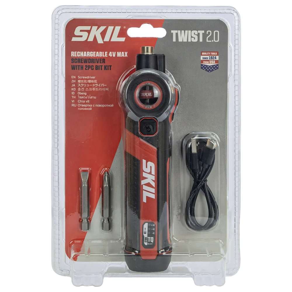 Комплектация Аккумуляторная отвертка SKIL SD5619 TWIST 2.0 4V; Кабель для зарядки USB-A – USB-C; Два сменных бита 2" (PH2 и SL6)