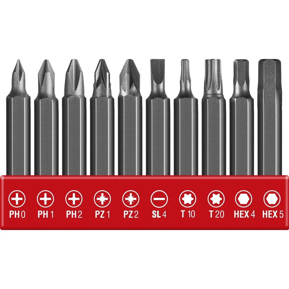 Комплектация Отвертка; Зарядное устройство; Биты 50 мм: PH0, PH1, PH2, PZ1, PZ2, S4, T10, T20, HEX4, HEX5; Инструкция; Кейс