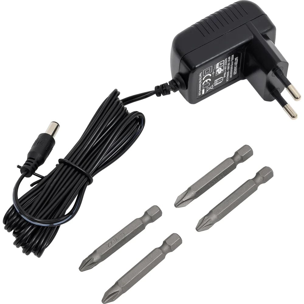 Комплектация Отвертка; Бита, 4 шт; Зарядное устройство; Блистер