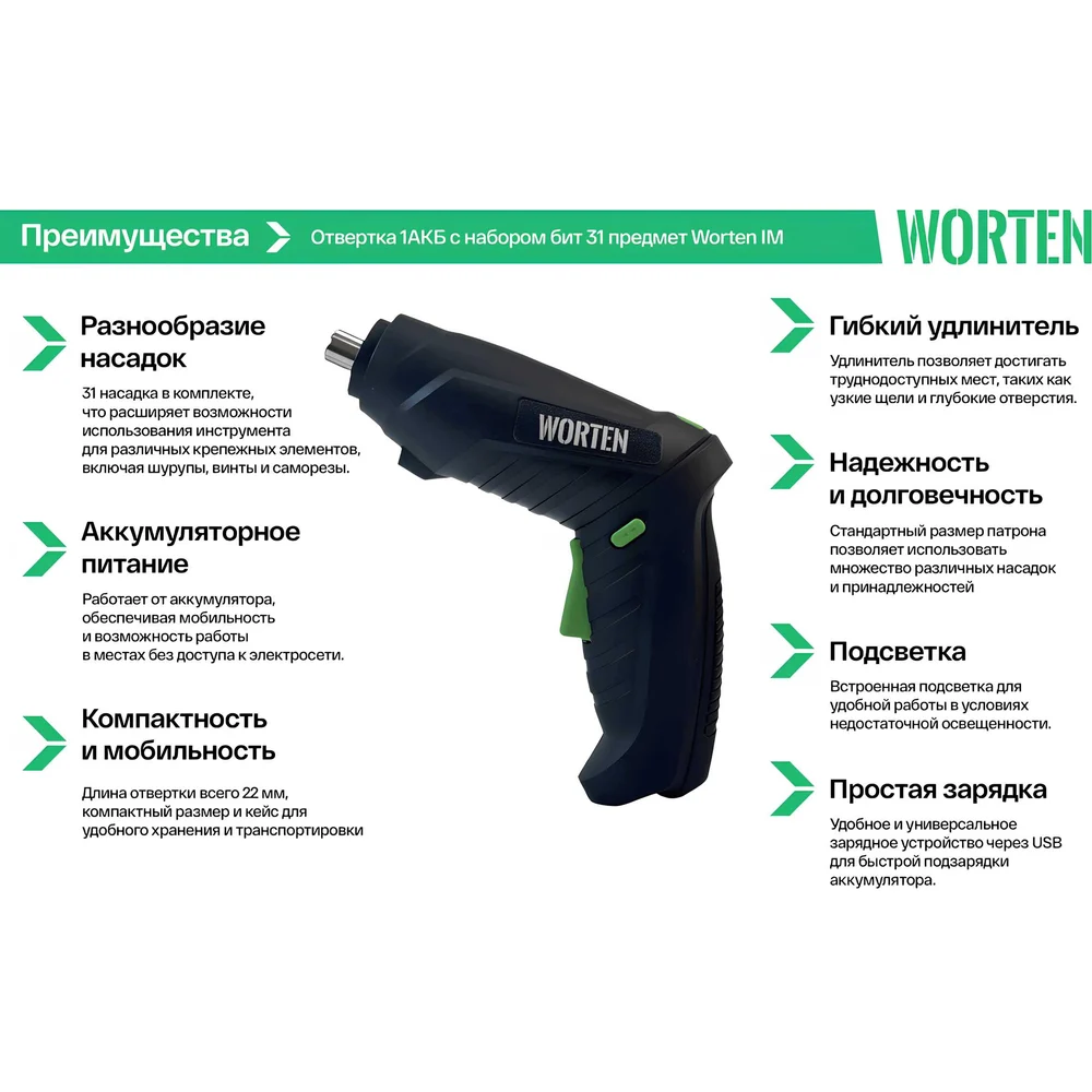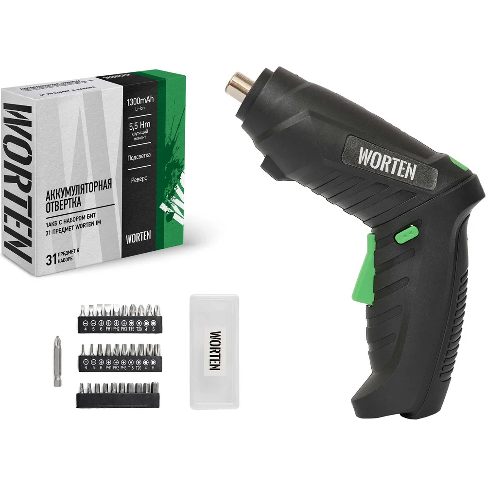 Аккумуляторная отвертка WORTEN 4В, 1АКБ, 1,3 Ач, с набором бит 31 предмет КА-90000327