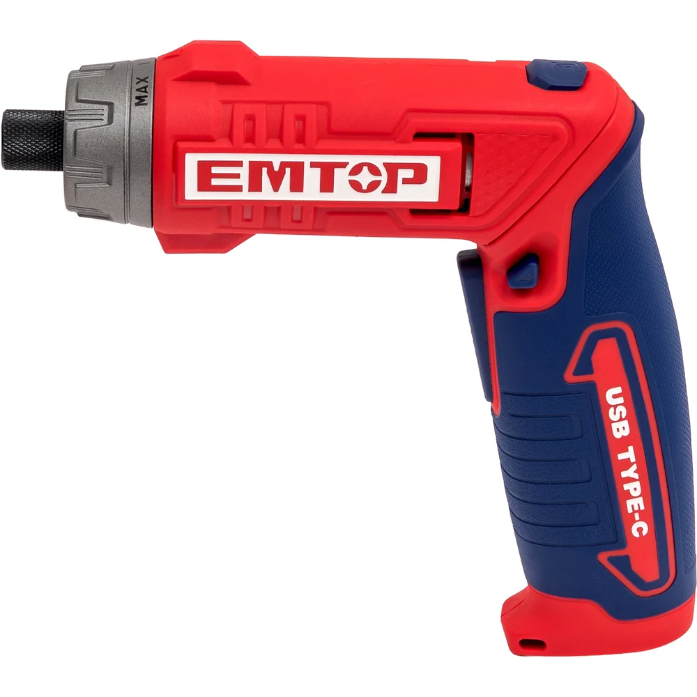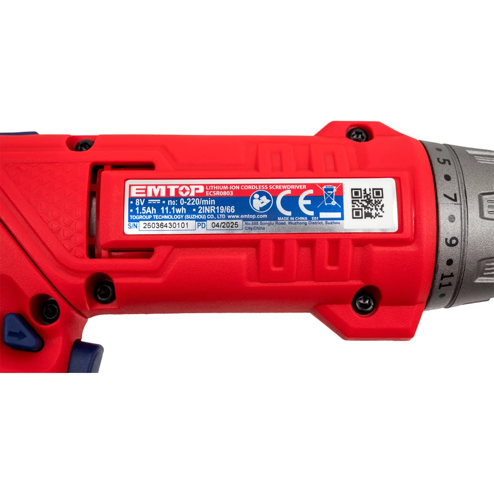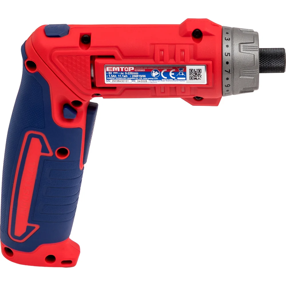 Отвертка аккумуляторная emtop напряжение: 8 В Шестигранный хвостовик: 1/4 " Скорость холостого хода: 220 об / мин Максимальный крутящий момент: 6 Нм ECSR0803