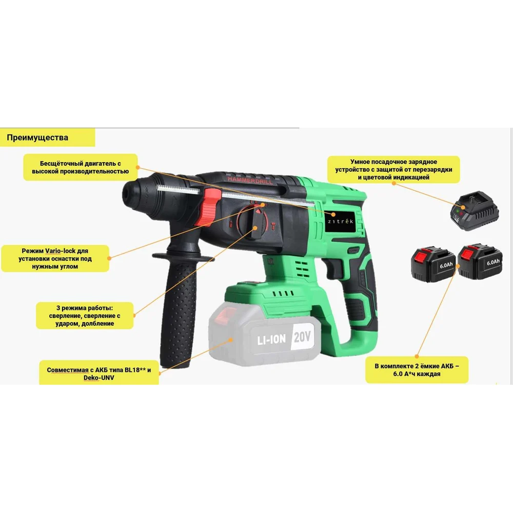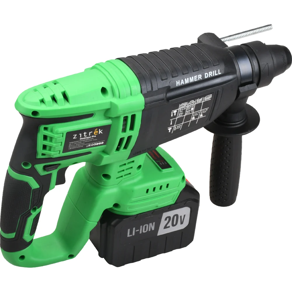Купить Перфоратор аккумуляторный бесщеточный Zitrek Destroyer Pro (20В, Li-ion 2x6.0Ач, з/у, кейс) 063-4373 по лучшей цене с доставкой - интернет магазин №1 в России