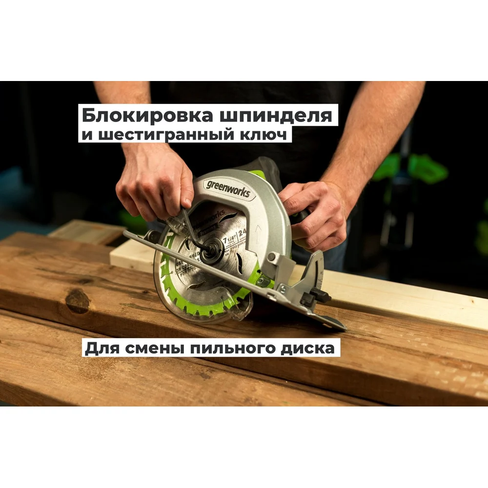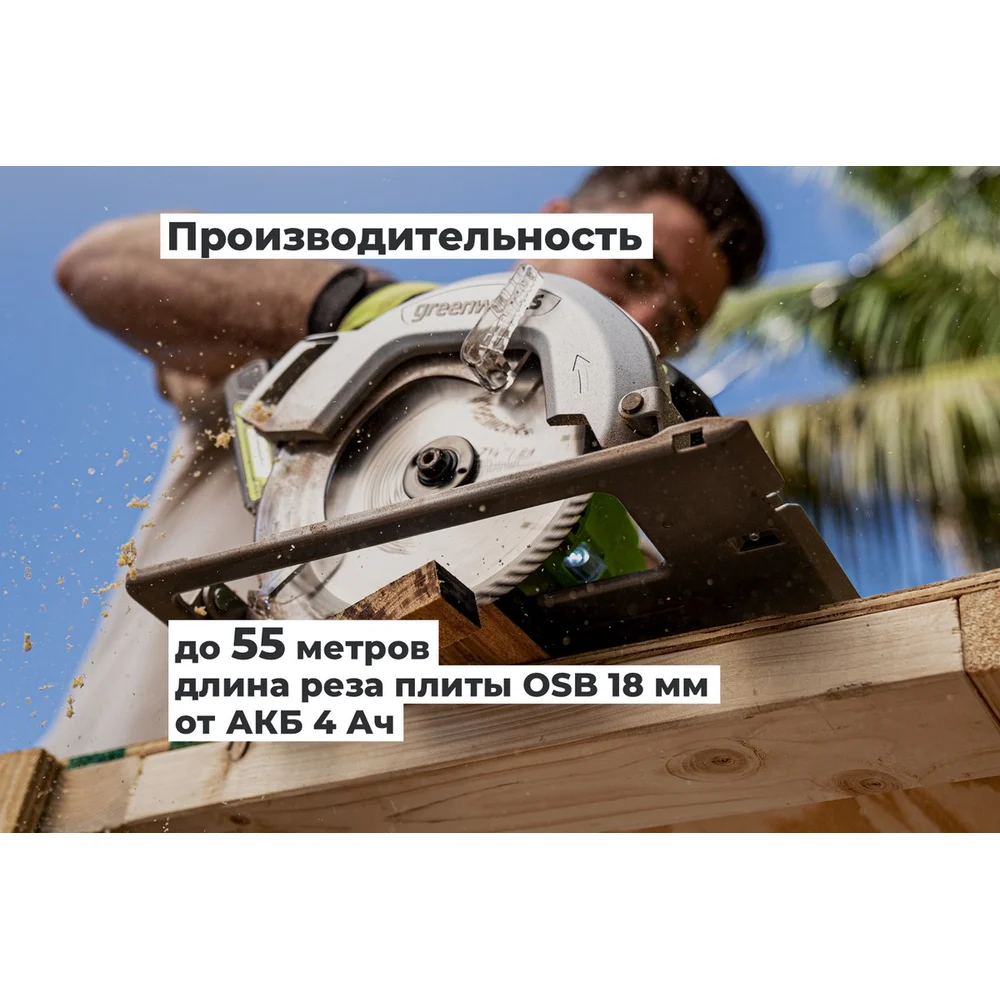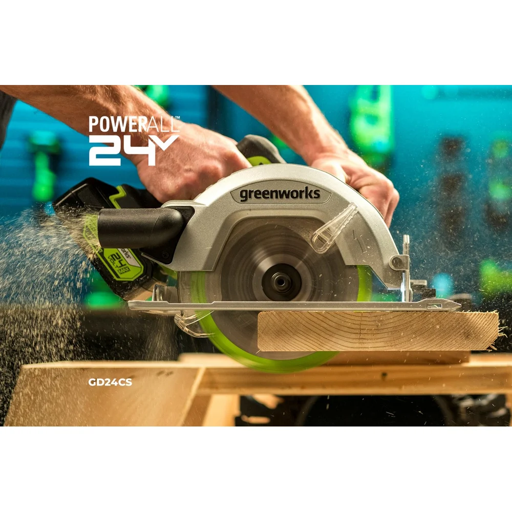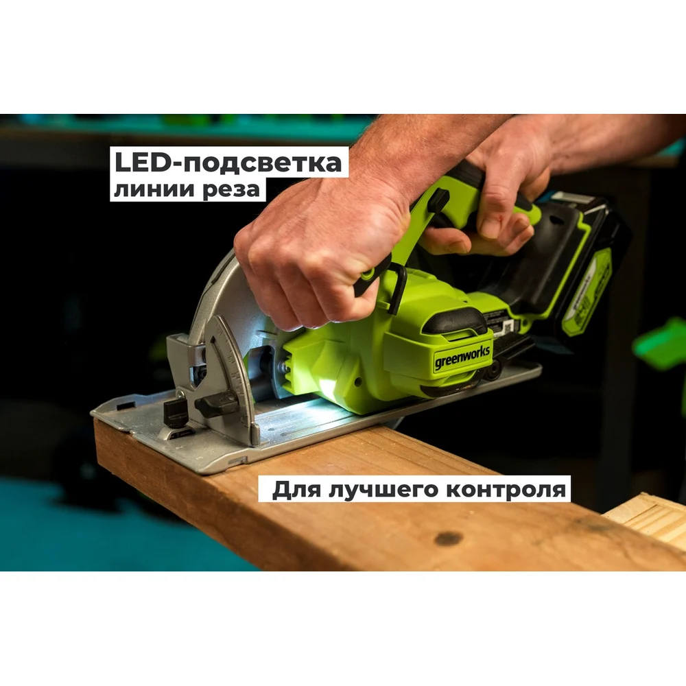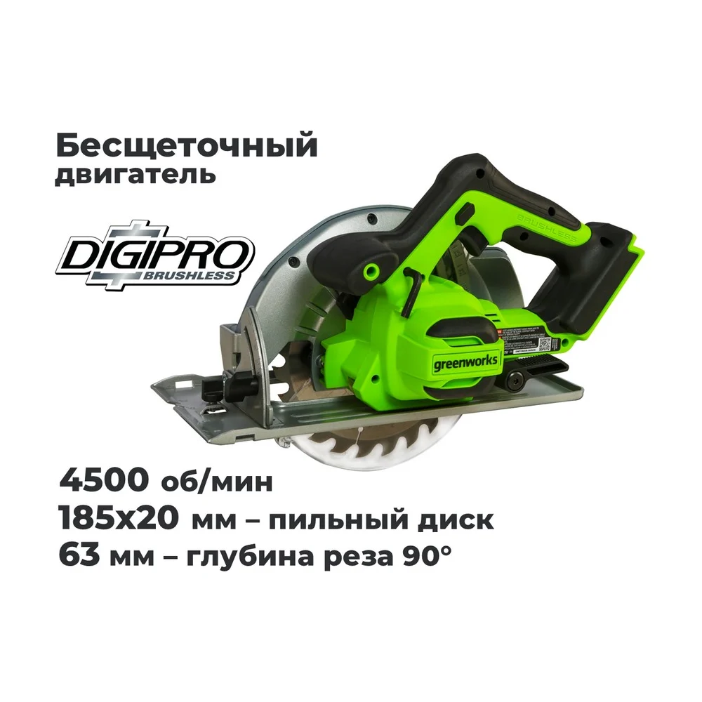 Дисковая пила GreenWorks GD24CS, 24V,б/щет, диск 185х20мм, 4500 об/мин, рез 63мм,1x4Ач,ЗУ, коробка 1500907VUB