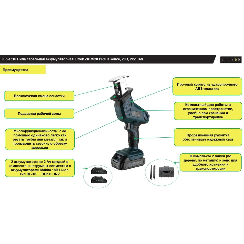 Купить Пила сабельная аккумуляторная Zitrek ZKRS20 PRO в кейсе, 20В, 2x2.0Ач 085-1316 по лучшей цене с доставкой - интернет магазин №1 в России