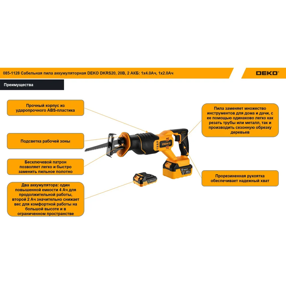 Купить Сабельная пила аккумуляторная DEKO DKHS20 PRO 20В, 2 АКБ: 1x4.0Ач, 1x2.0Ач 085-1128 по лучшей цене с доставкой - интернет магазин №1 в России
