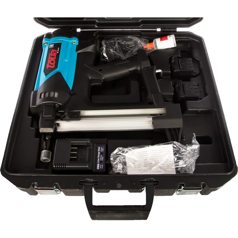 Комплектация Гвоздезабивной инструмент по бетону TOUA GSN40В; 2 аккумулятора; Зарядное устройство; Адаптер 220V AC-6V DC; Инструкция; Пластиковый кейс