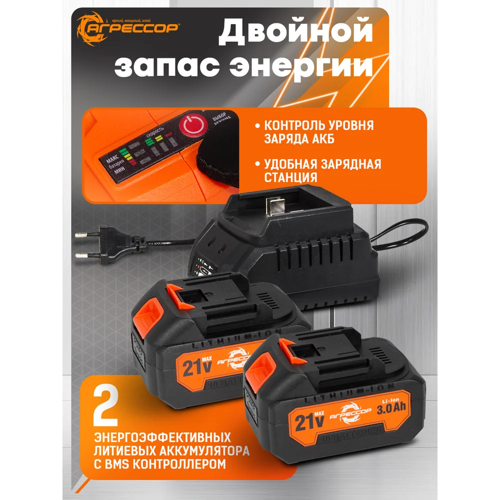 Аккумуляторная УШМ Агрессор 750W, 21V/3А, бесщеточный мотор, АКБ 2 шт., М14, под диск125мм., зарядное устройство 220В, пластиковый кейс BL-750W