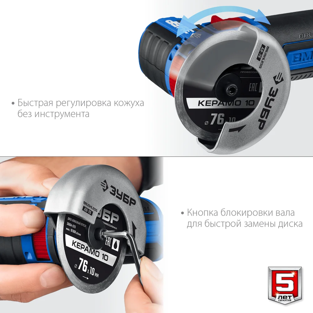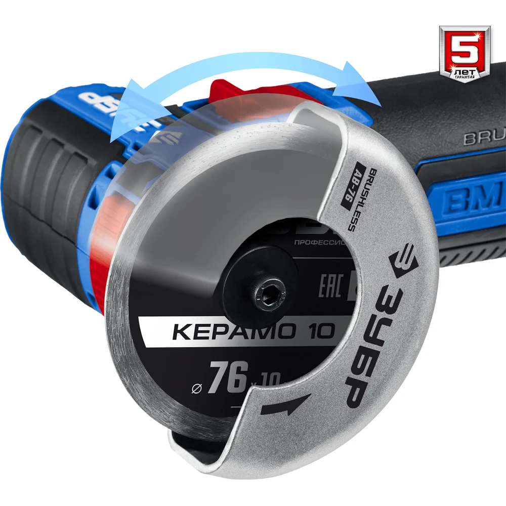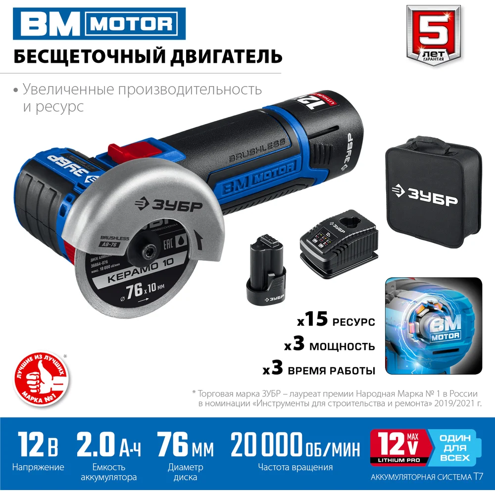 Бесщеточная угловая шлифмашина ЗУБР Профессионал 12 В, 2 АКБ, в сумке AB-76-22