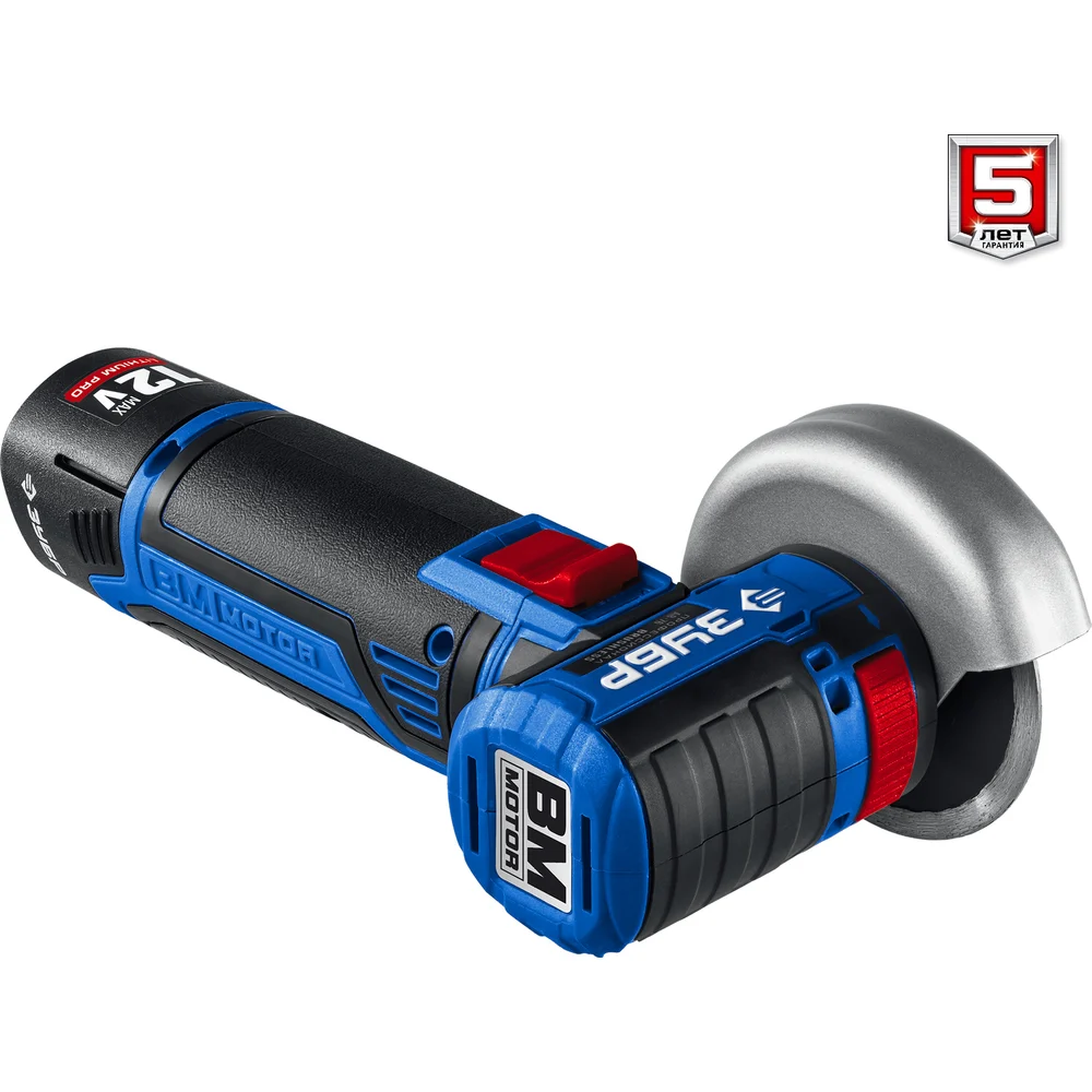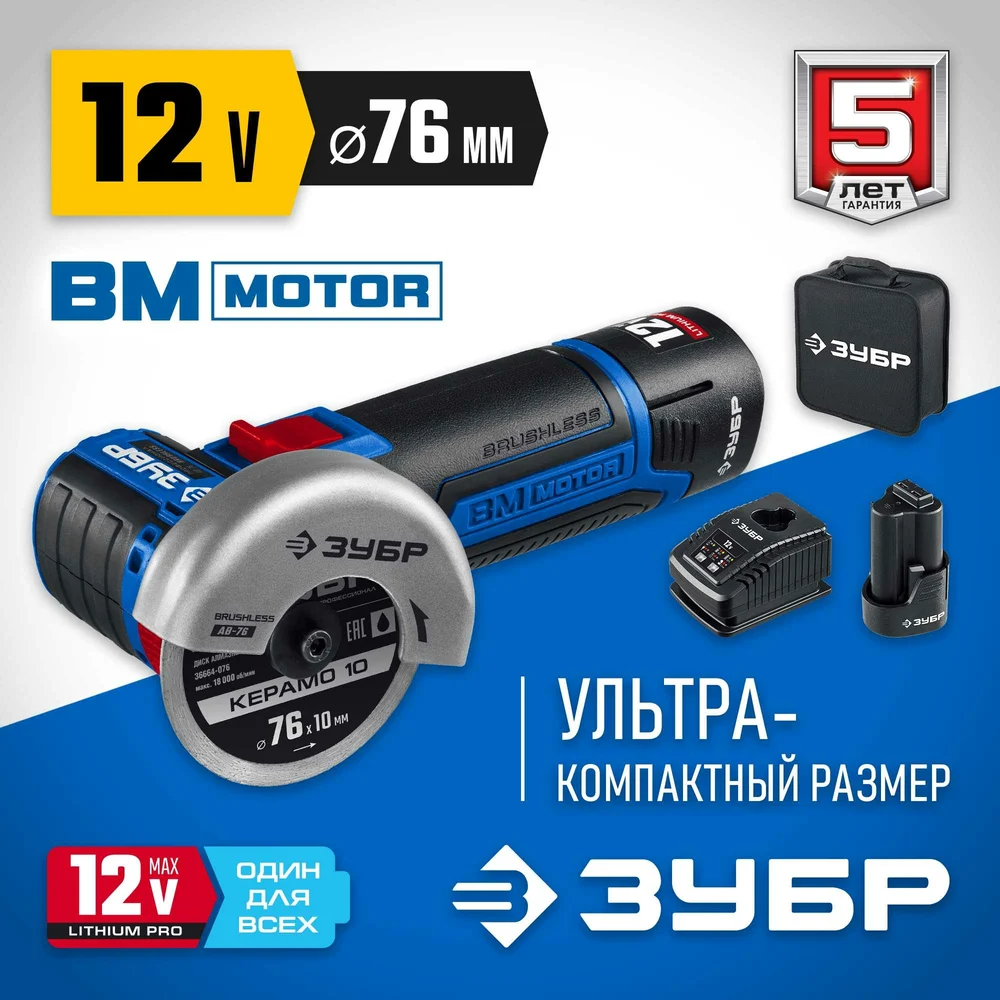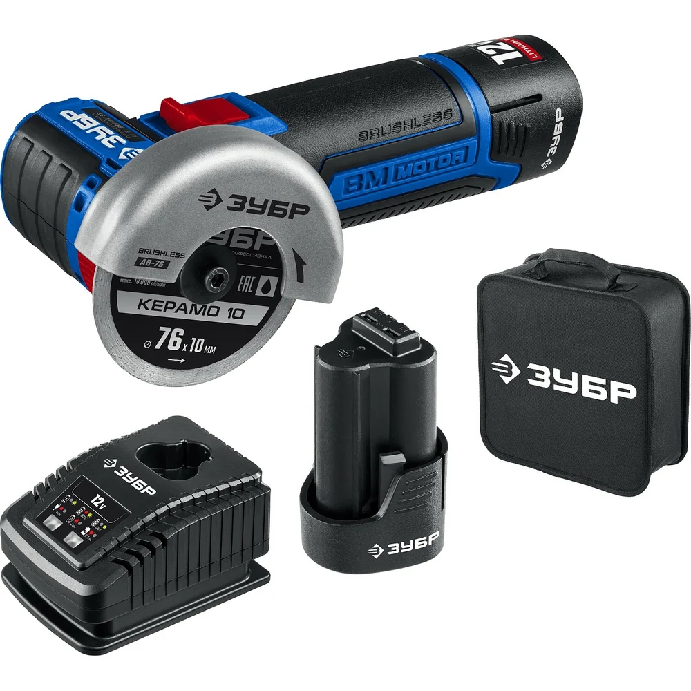 Купить Бесщеточная угловая шлифмашина ЗУБР Профессионал 12 В, 2 АКБ, в сумке AB-76-22 по лучшей цене с доставкой - интернет магазин №1 в России