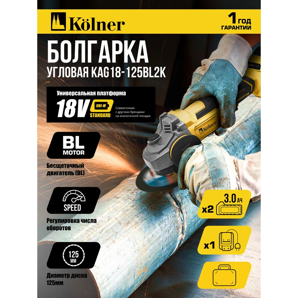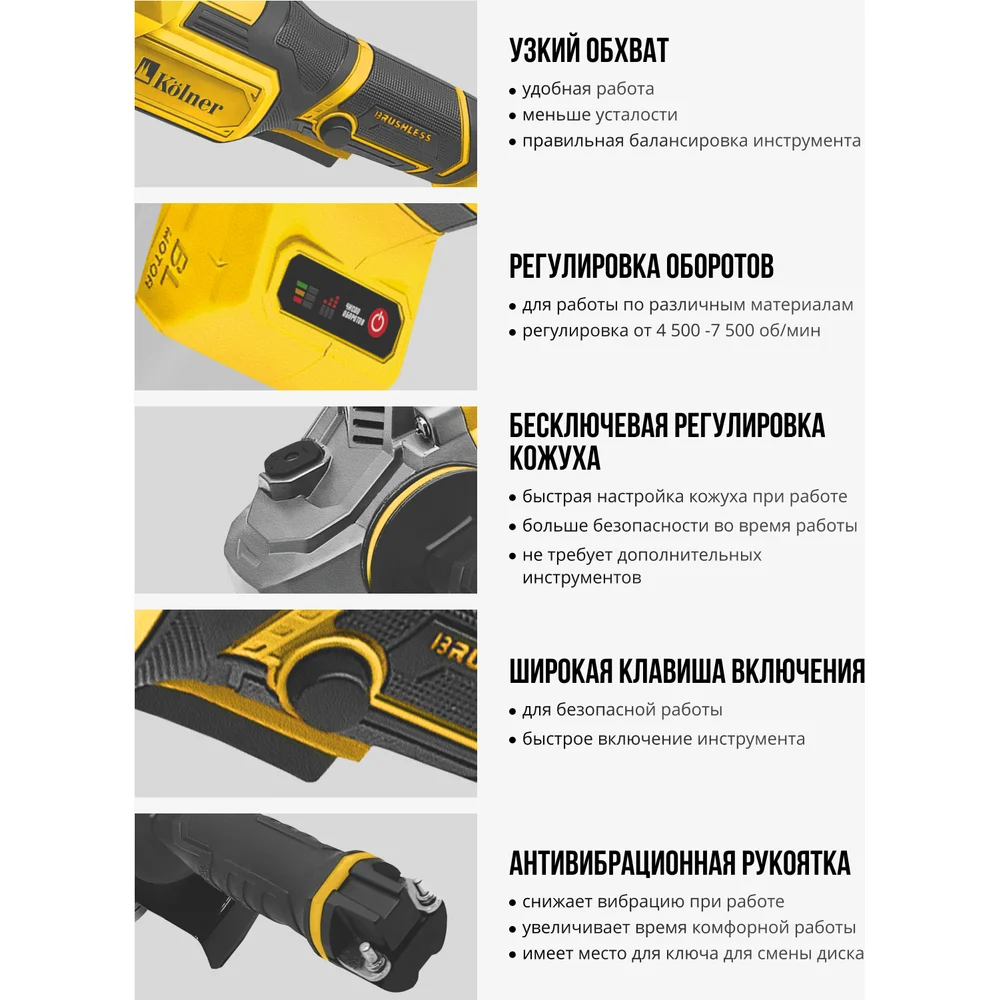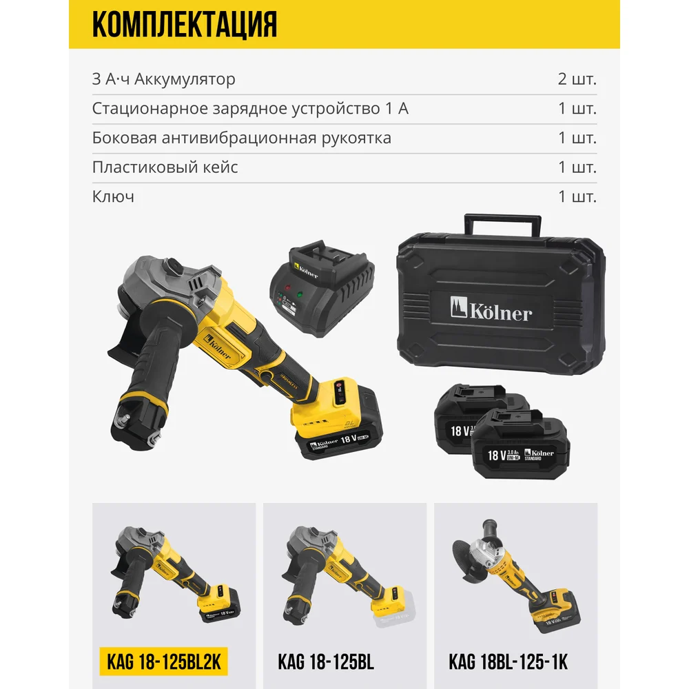 Купить Машина углошлифовальная аккумуляторная Kolner (УШМ), 18V UNI-M, BL, 125 мм, KAG 18-125BL2K, 5200-7500 об/мин 8020700033 по лучшей цене с доставкой - интернет магазин №1 в России