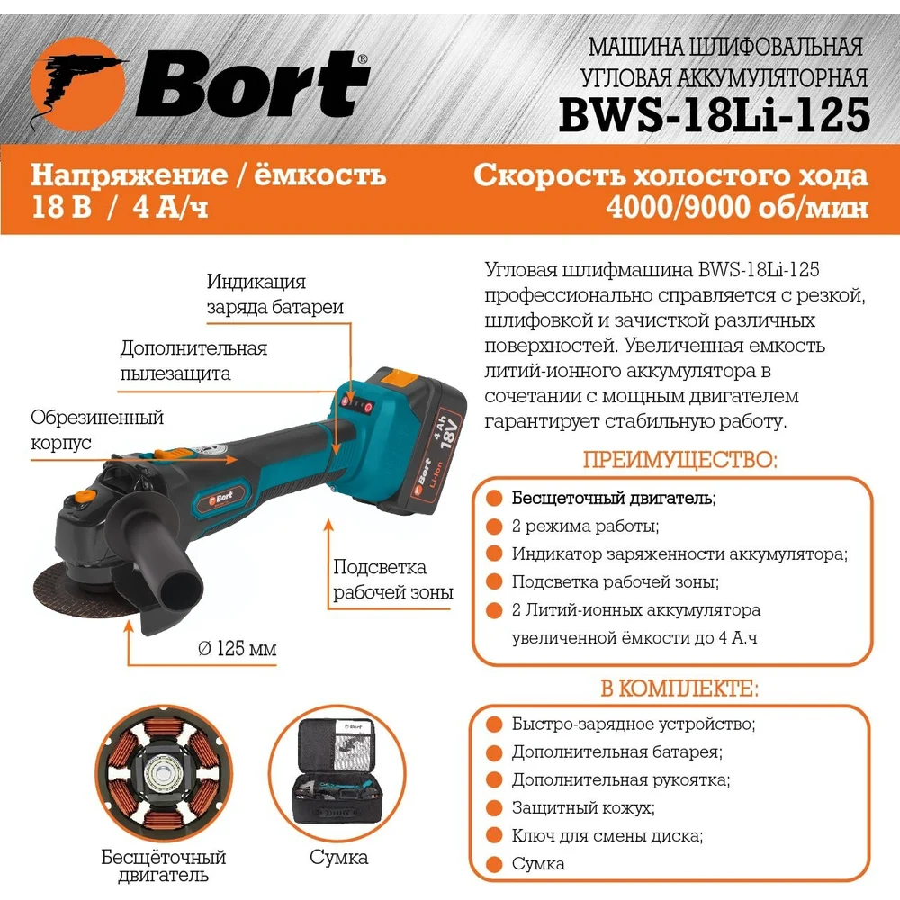 Купить Шлифовальная угловая аккумуляторная машина BORT BWS-18Li-125 93722340 по лучшей цене с доставкой - интернет магазин №1 в России