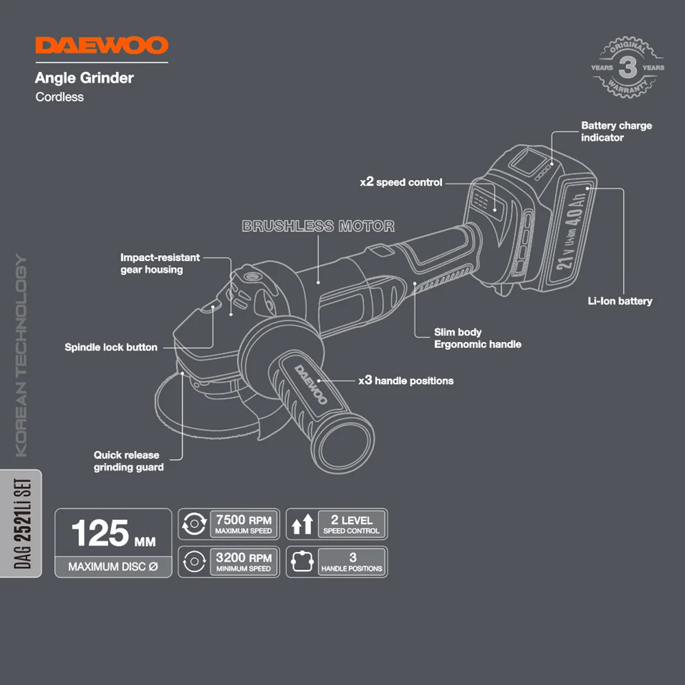 Купить Углошлифовальная машина аккумуляторная DAEWOO DAG 2521Li SET по лучшей цене с доставкой - интернет магазин №1 в России