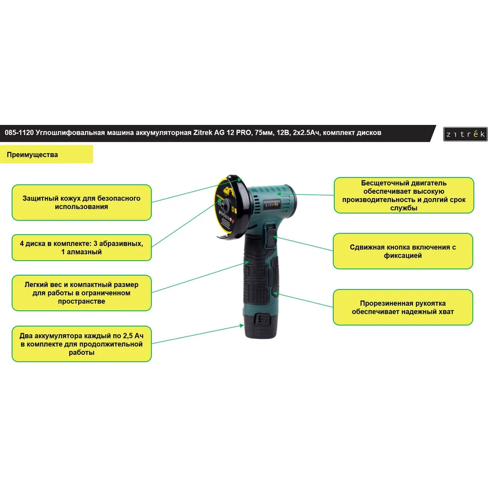 Купить Углошлифовальная машина аккумуляторная Zitrek AG 12 PRO, 75мм, 12B, 2x2.5Ач, комплект дисков 085-1120 по лучшей цене с доставкой - интернет магазин №1 в России