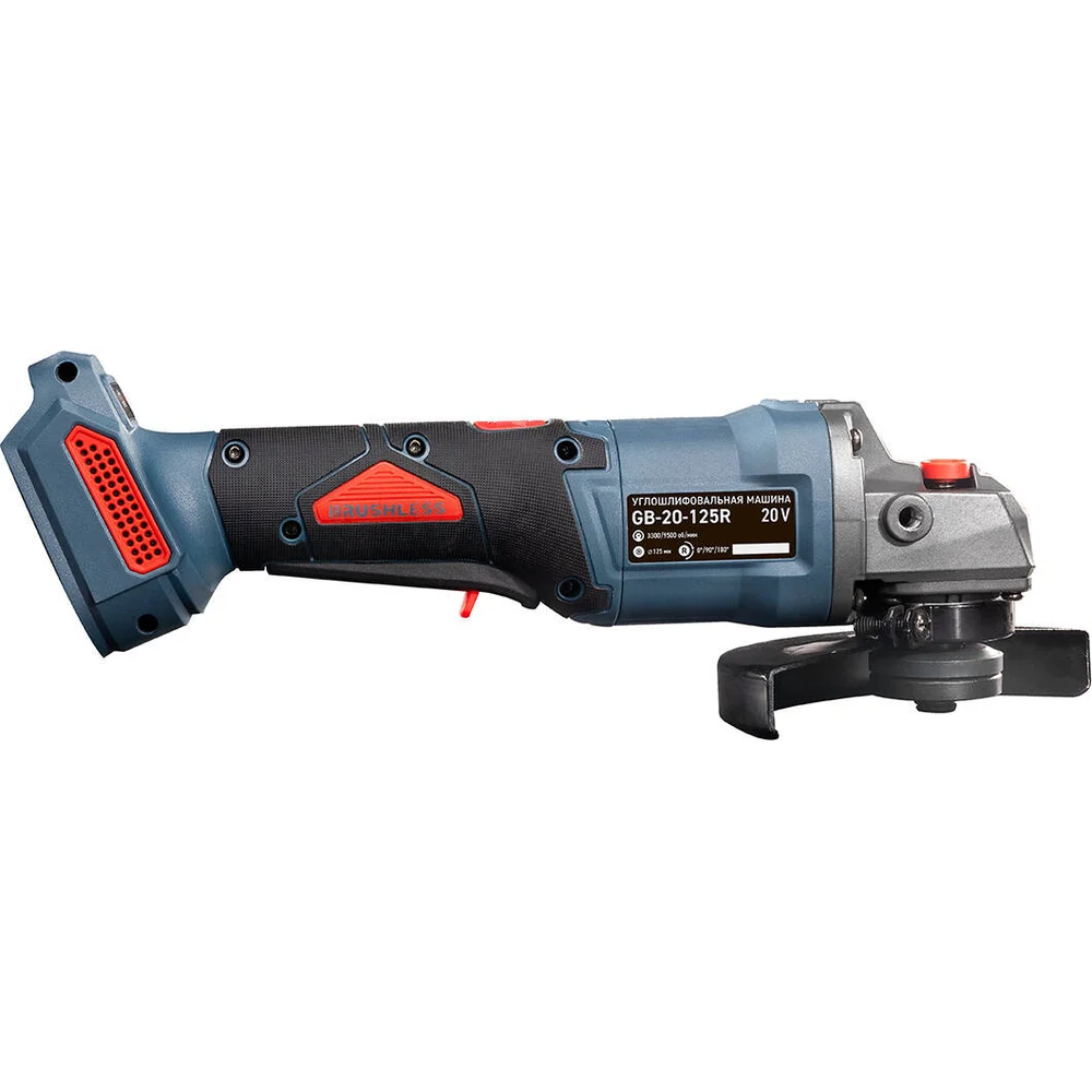 Комплектация Бесщеточная угловая шлифмашина GB-20–125R; Фирменная обрезиненная рукоятка; Защитный кожух; Ключ специальный; Паспорт; Картонная коробка; В комплекте: поставляется без аккумулятора и зарядного устройства