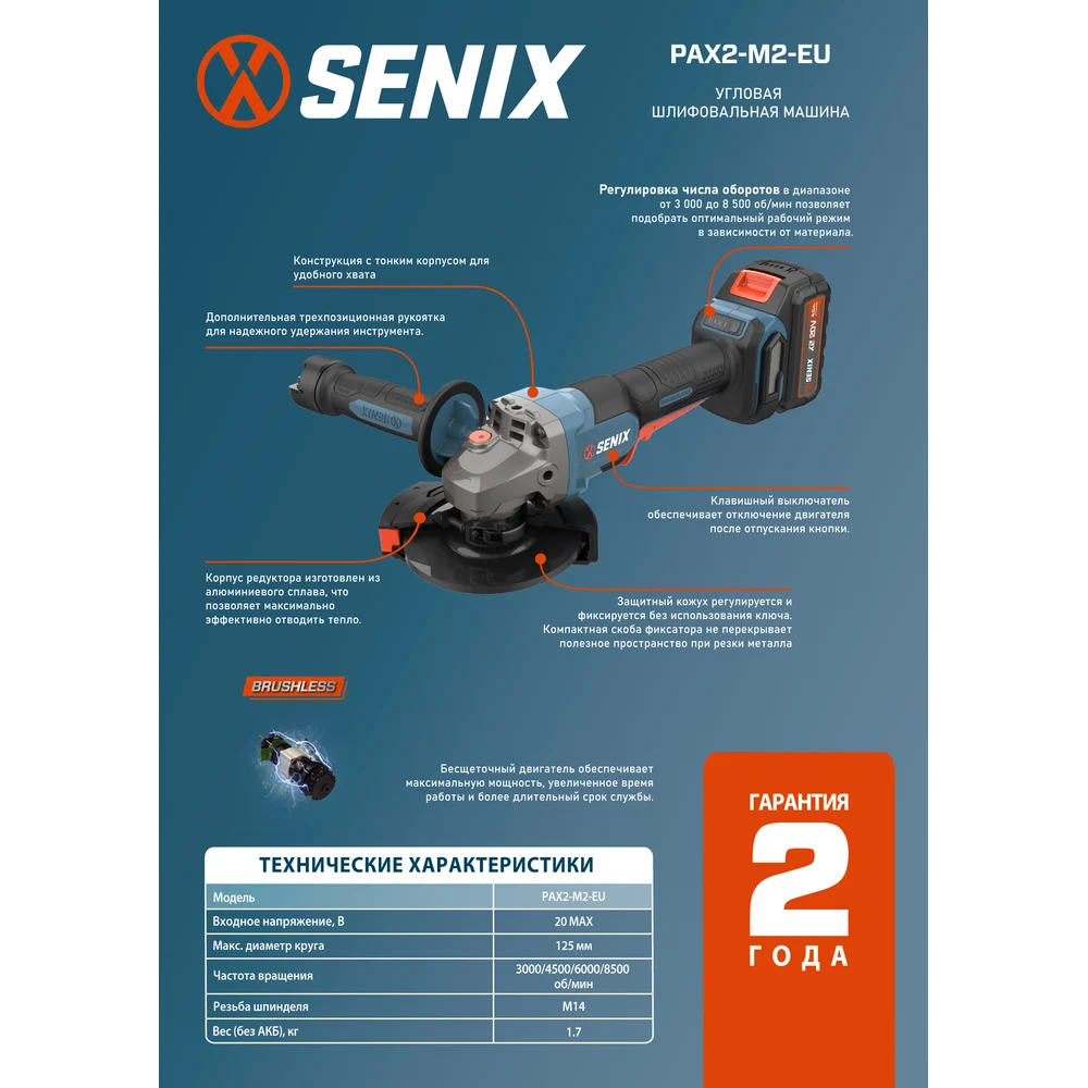 Купить УШМ (болгарка) SENIX серия X2 20В 125 мм, акб 4Ач, ЗУ, кейс PAX2-M2-EU по лучшей цене с доставкой - интернет магазин №1 в России
