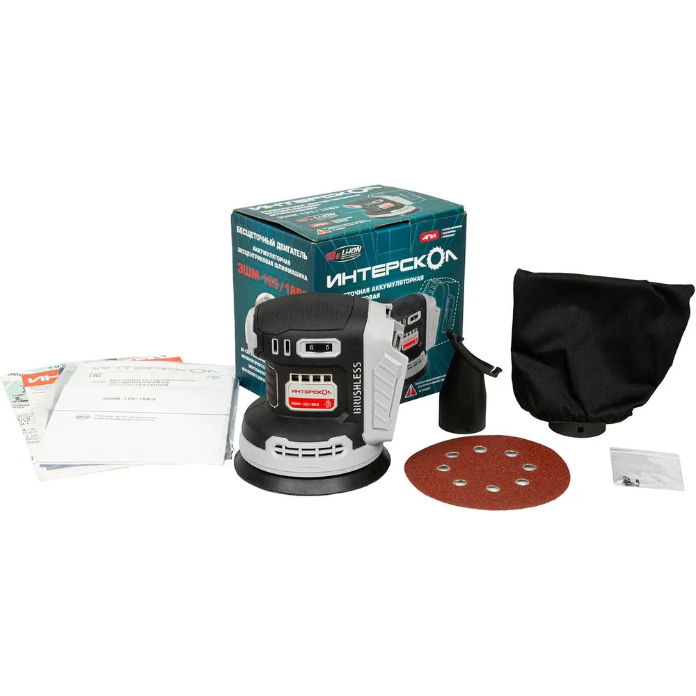 Комплектация Бесщеточная аккумуляторная эксцентриковая шлифовальная машина ИНТЕРСКОЛ ЭШМ-125/18ВЭ; Пылеотводящий патрубок; Пылесборник; Шлифовальный материал - 5 шт; Картон; Инструкция по эксплуатации и Руководство по безопасности; Гарантийный талон; Аккумуляторные батареи и зарядное устройство в комплект поставки не входят и приобретаются отдельно!