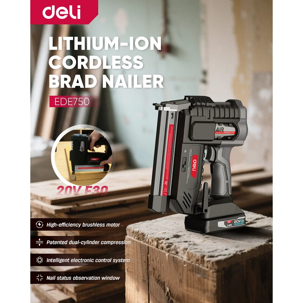 Профессиональный гвоздезабивной пистолет DELI аккумуляторный DE750 (2АКБ, 20В х 2Ач + ЗУ, до 80 гвоздей в минуту) 225715