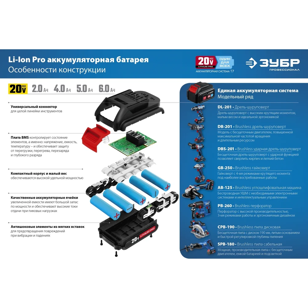 Зарядное устройство для Li-Ion АКБ ЗУБР Профессионал 20В, 6А, тип T7 RT7-20-6