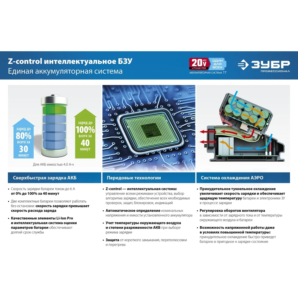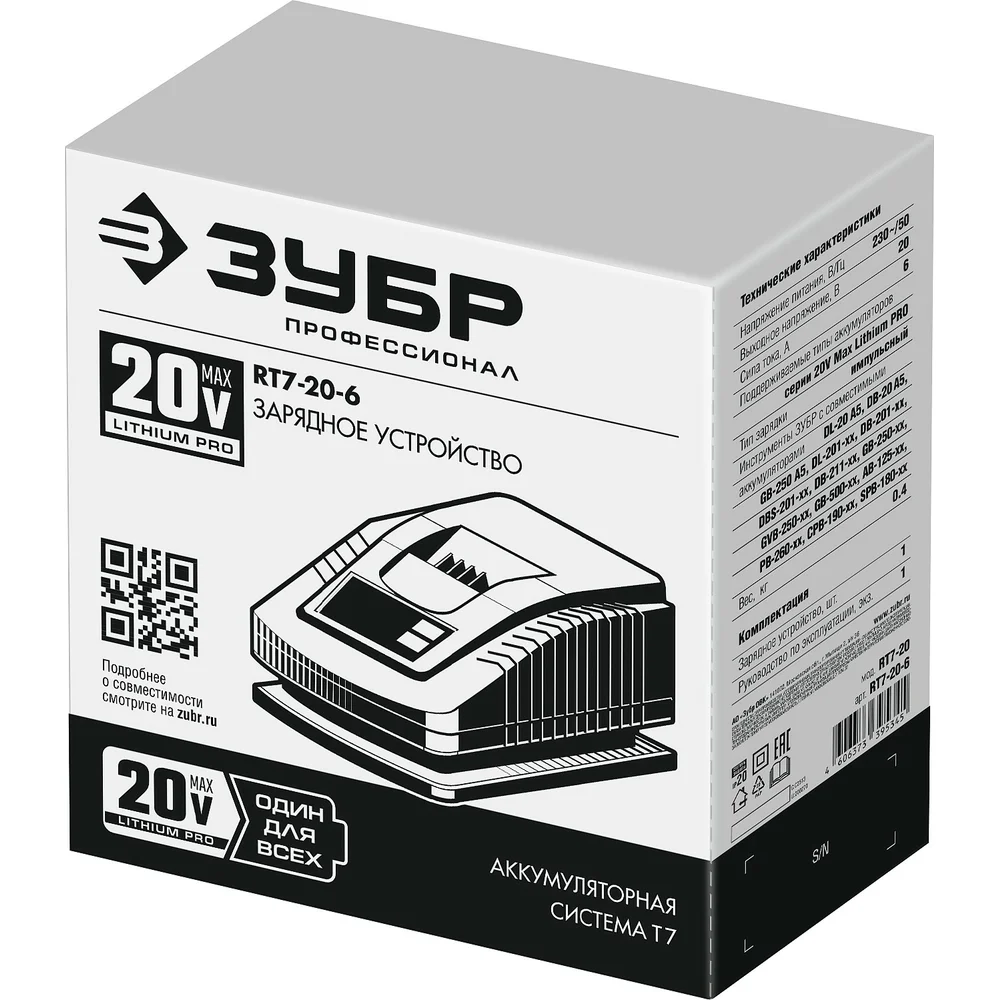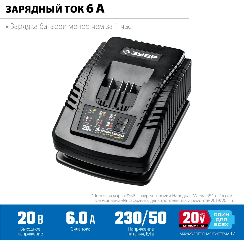 Купить Зарядное устройство для Li-Ion АКБ ЗУБР Профессионал 20В, 6А, тип T7 RT7-20-6 по лучшей цене с доставкой - интернет магазин №1 в России