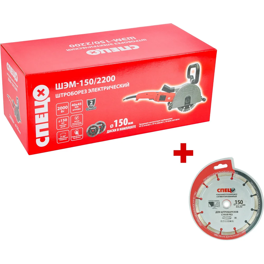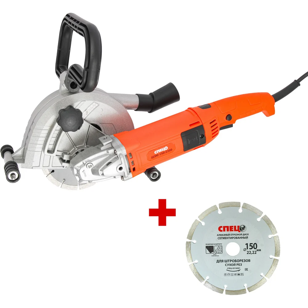 Купить Штроборез электрический Спец ШЭМ-150/2200 2000Вт, 6500об/мин, 2 диска 150мм, штроба 40x45мм, подкл пылесоса, коробка + Диск алмазный отрезной 150*22,2*1,8мм СПЕЦ-4124/0516001 по лучшей цене с доставкой - интернет магазин №1 в России