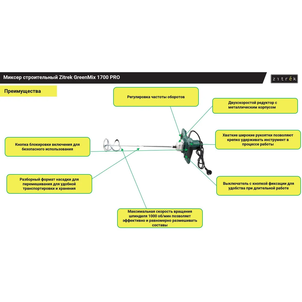 Купить Миксер строительный Zitrek GreenMix 1700 PRO 085-1077 по лучшей цене с доставкой - интернет магазин №1 в России