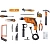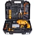 Комплектация Электродрель; Ручка для дрели; Ограничитель глубины; Сверла по металлу 6 шт. (3, 4, 5, 6, 8, 10 мм); Сверла по бетону 3 шт. (6, 8, 10 мм), сверла по кафелю 2 шт. (6, 8 мм); Сверла по дереву 6 шт. (3, 4, 5, 6, 8, 10 мм); Биты 10 шт; Комбинированные плоскогубцы 150 мм; Уровень; Ножовка по металлу 150 мм; Канцелярский нож; Разводной ключ 200 мм; Молоток; Рулетка 3 м; Комплект метизов 60 шт; Рукоятка с магнитным битодержателем; Кейсе