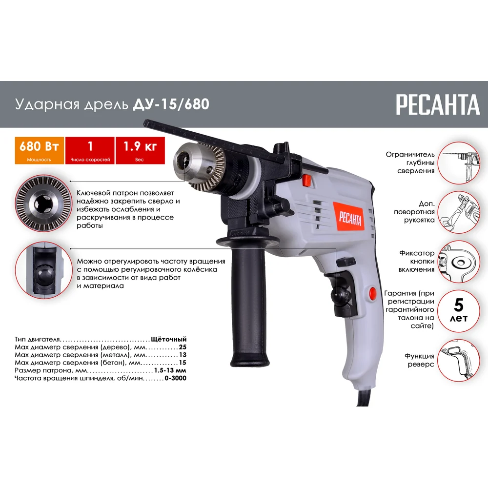 Купить Ударная дрель Ресанта ДУ-15/680 75/8/2 по лучшей цене с доставкой - интернет магазин №1 в России