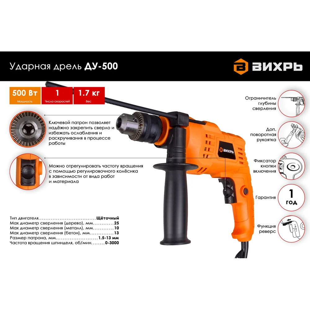 Купить Ударная дрель Вихрь ДУ-500 72/8/7 по лучшей цене с доставкой - интернет магазин №1 в России