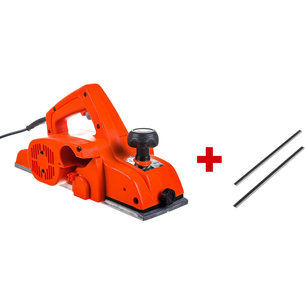 Комплектация Рубанок ручной электрический; Параллельная направляющая; Приспособление для заточки ножей; Приспособление для установки ножей; Ключ трубчатый; Инструкция с гарантийным талоном; Запасной ремень; Коробка; Запасные ножи в комплекте + ножи в подарок