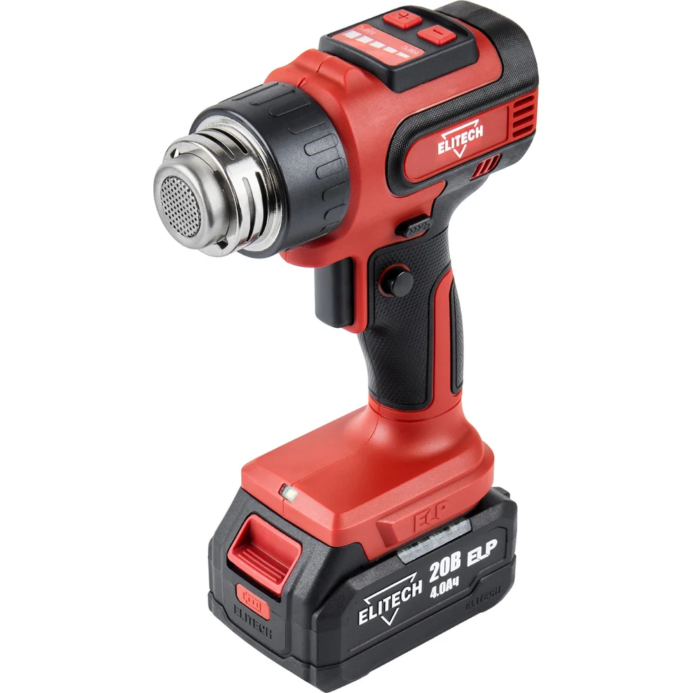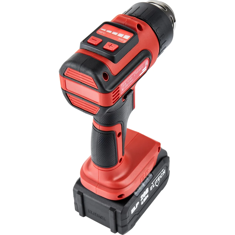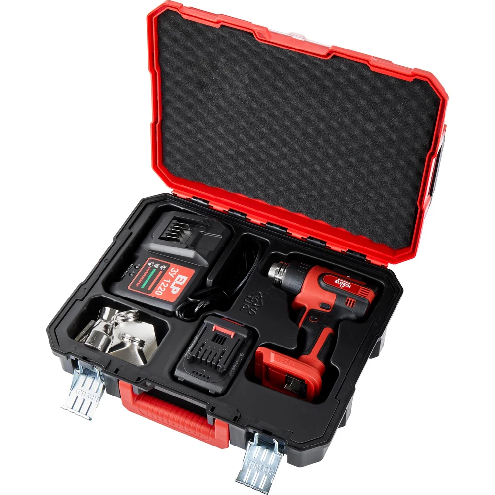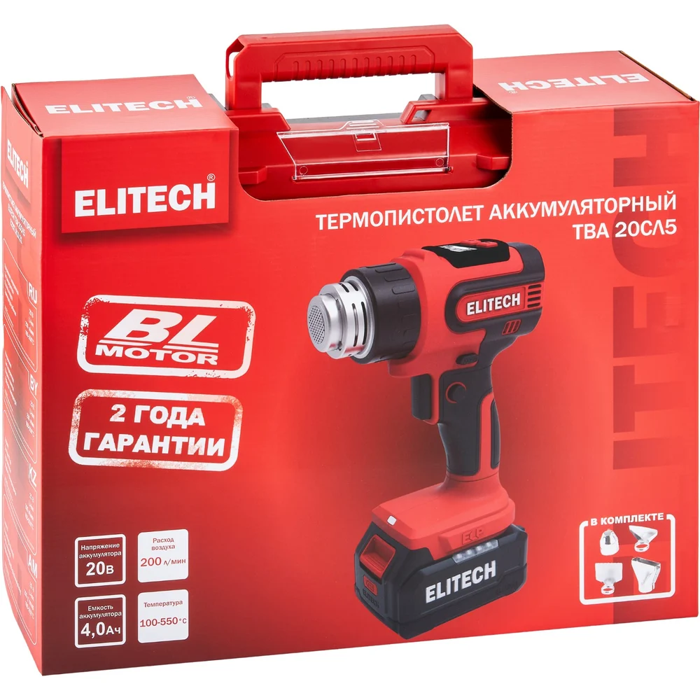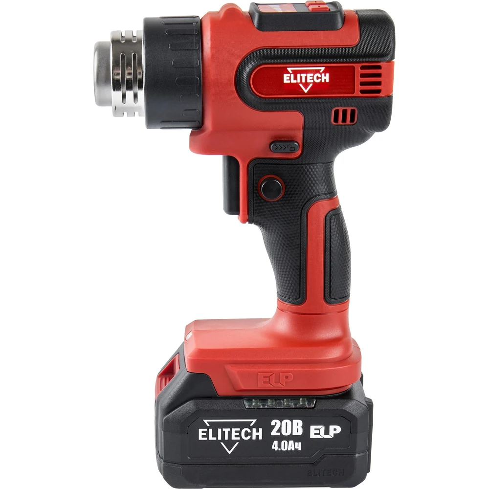 Комплектация Пистолет горячего воздуха; Аккумулятор Elitech ELP 20В 4Ач - 1шт; Зарядное устройство; Насадки - 4 шт; Кейс; Паспорт